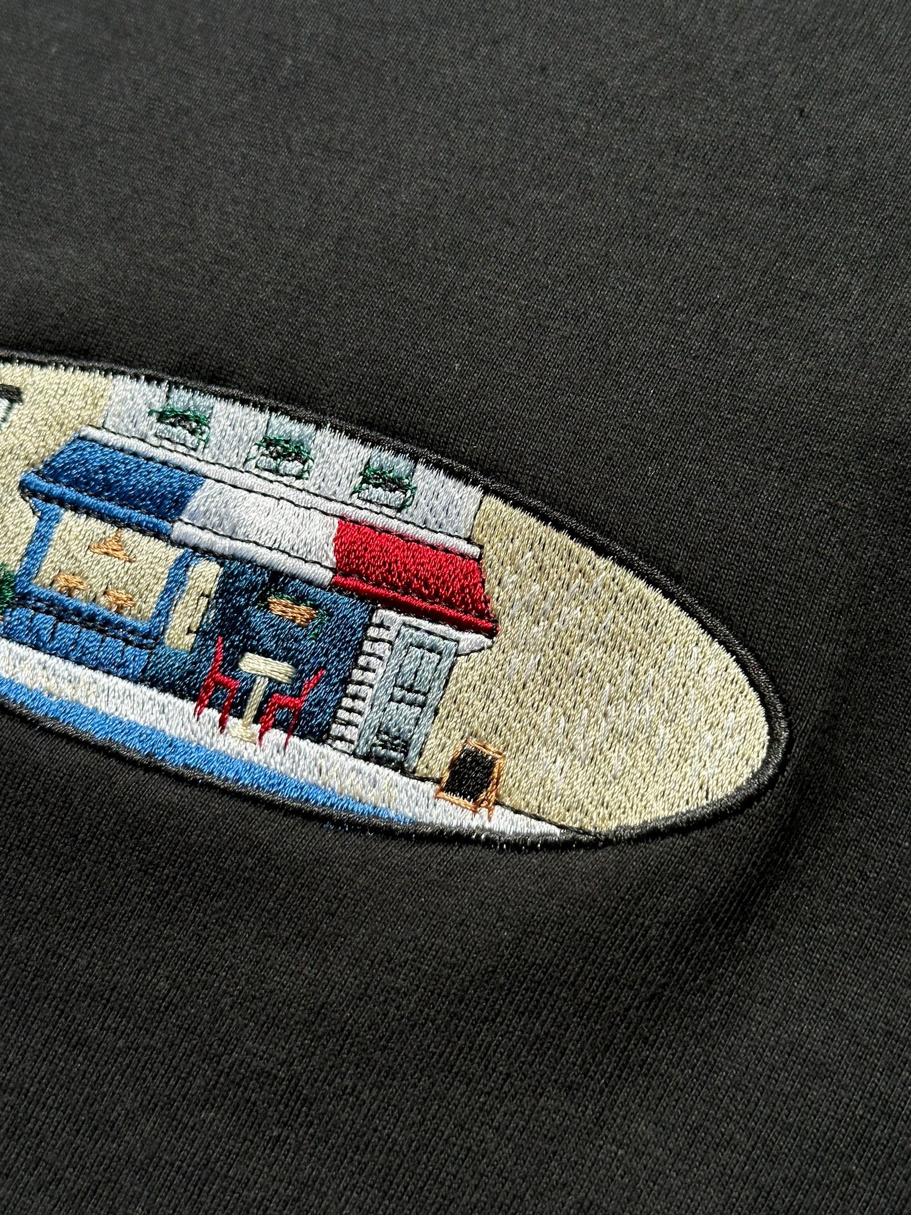 カフェの顔であるこのオーニングを、パリの街並みに溶け込む形で国旗調にしています。