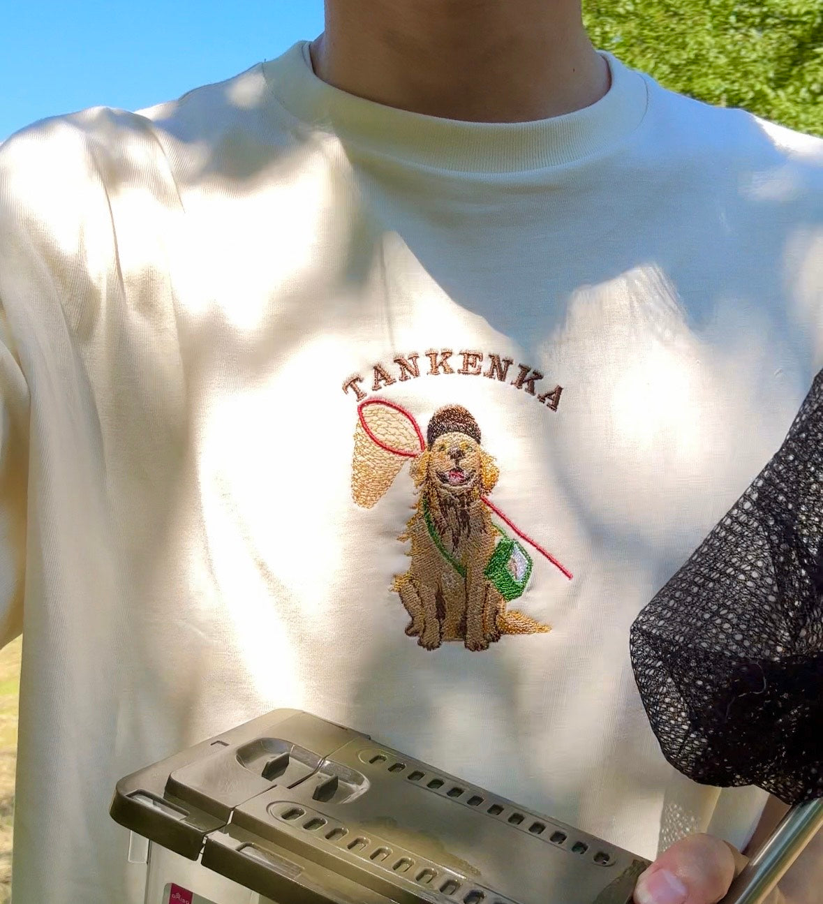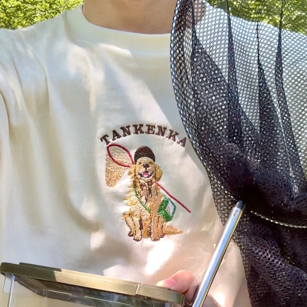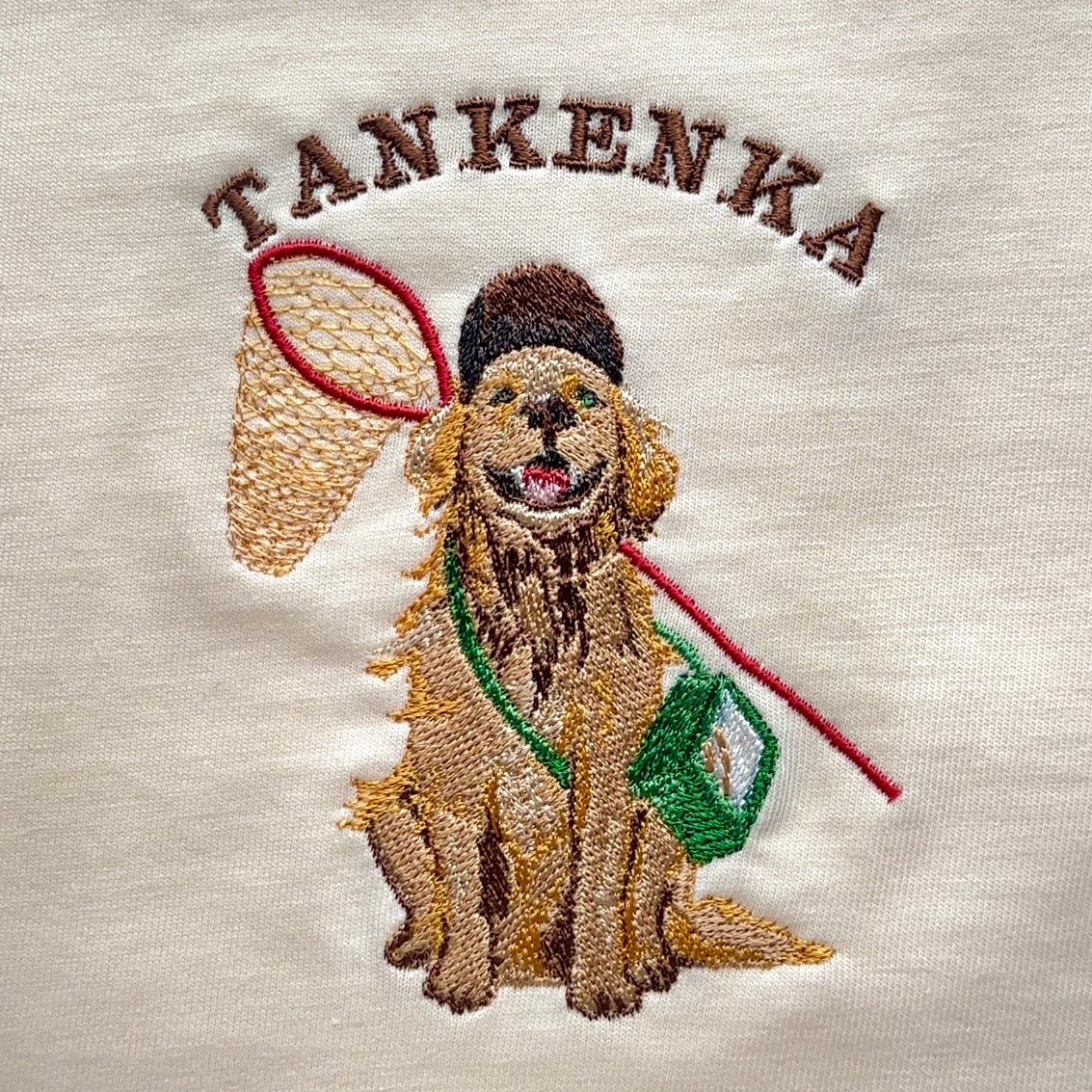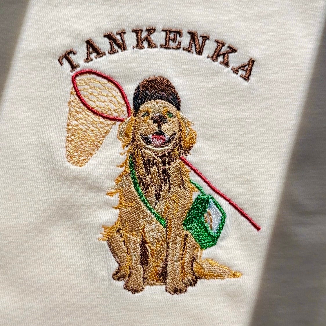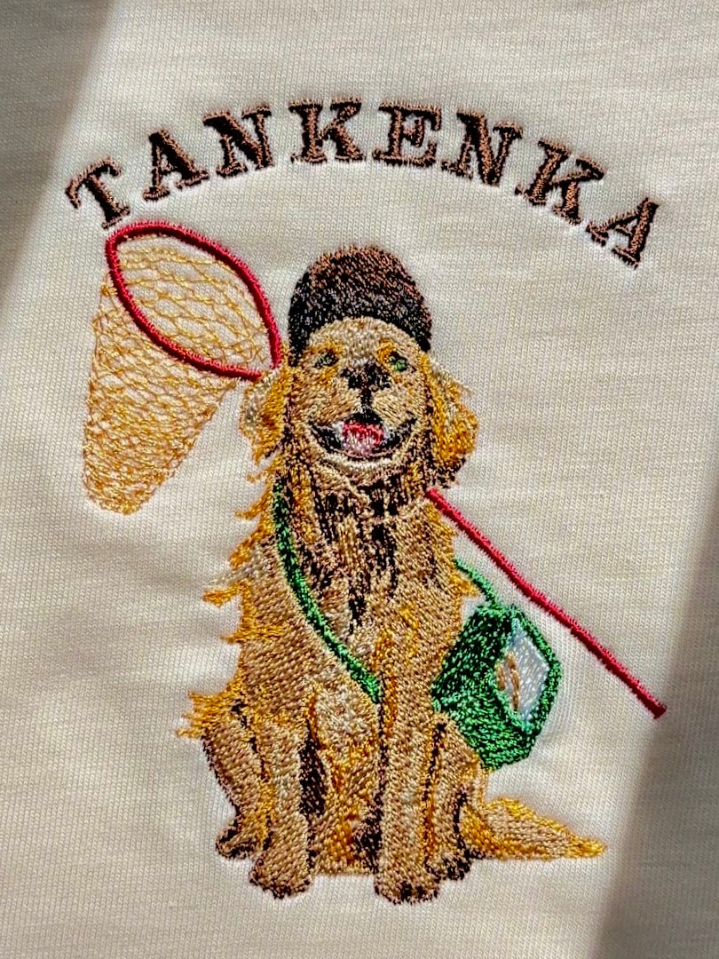 ゴールデンの肩には、虫かごと虫取り網がかかっています🔍