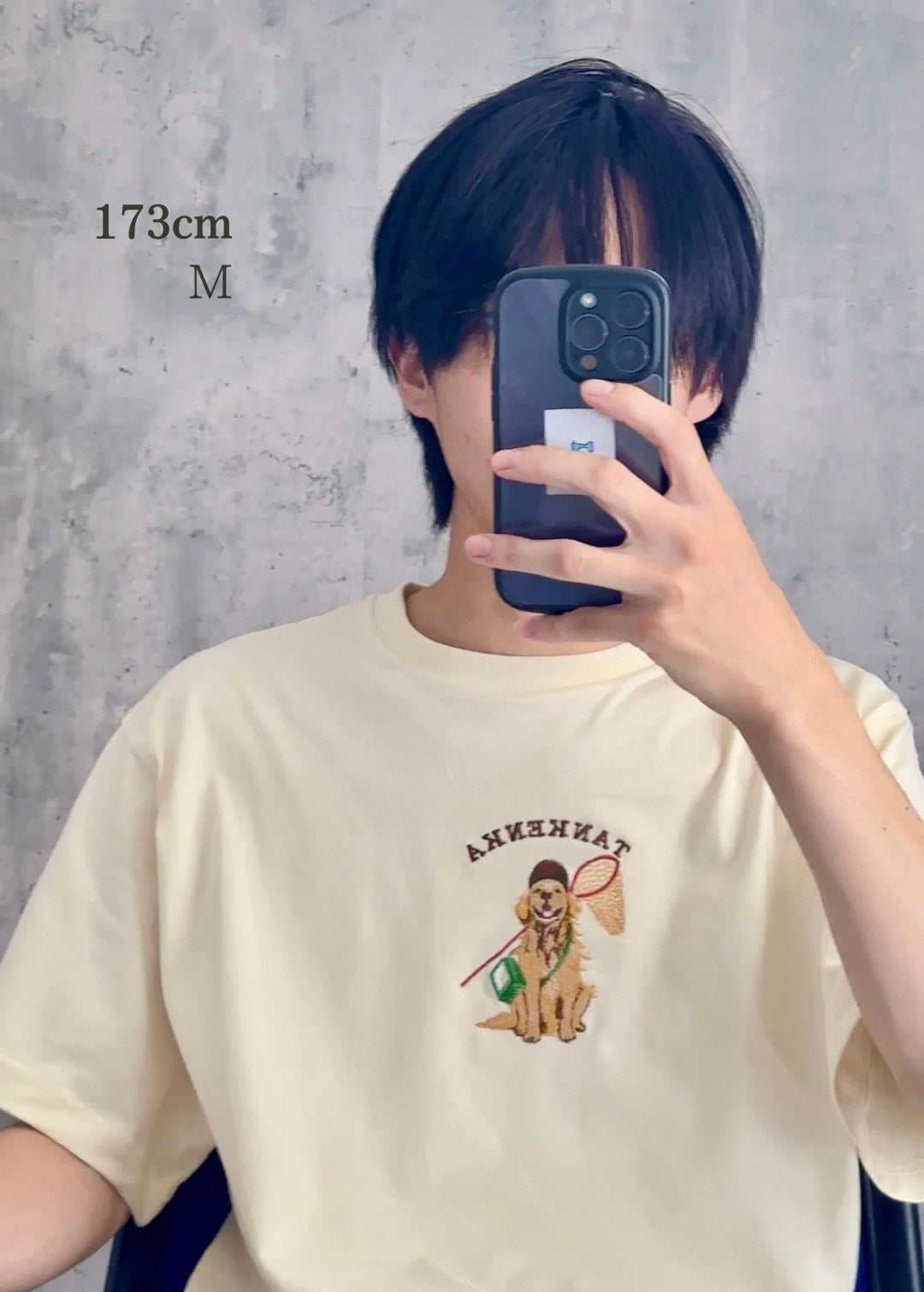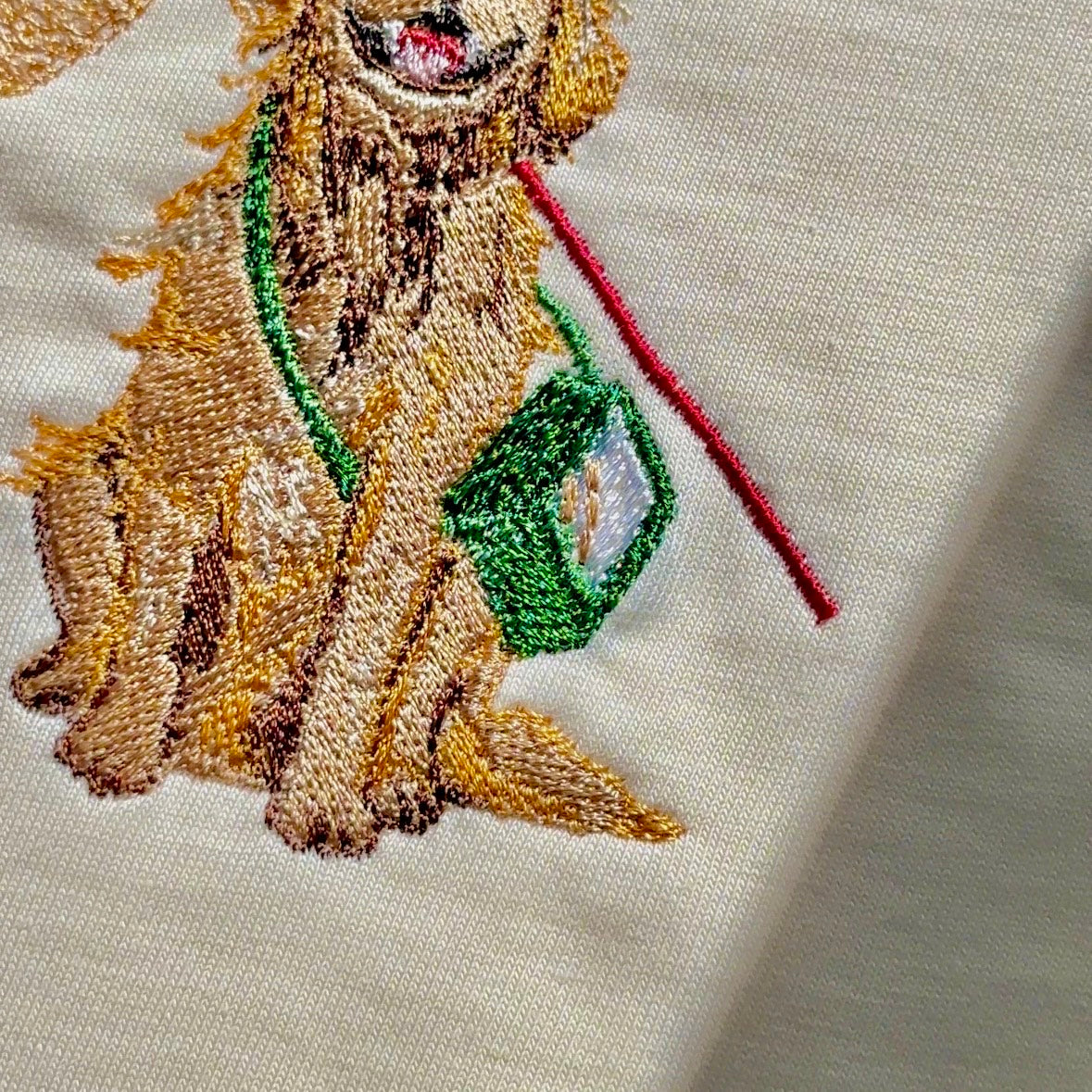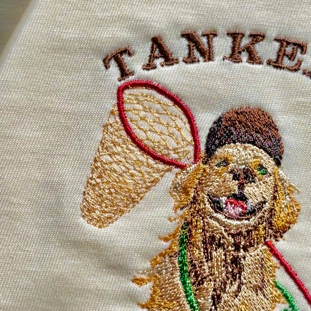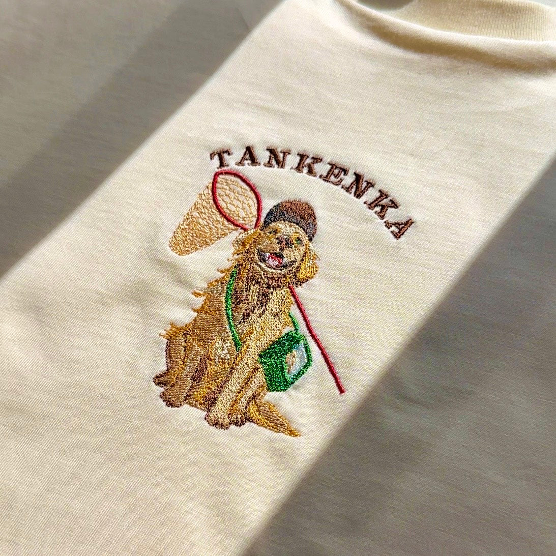 ゴールデンの肩には、虫かごと虫取り網がかかっています🔍
