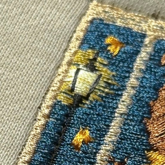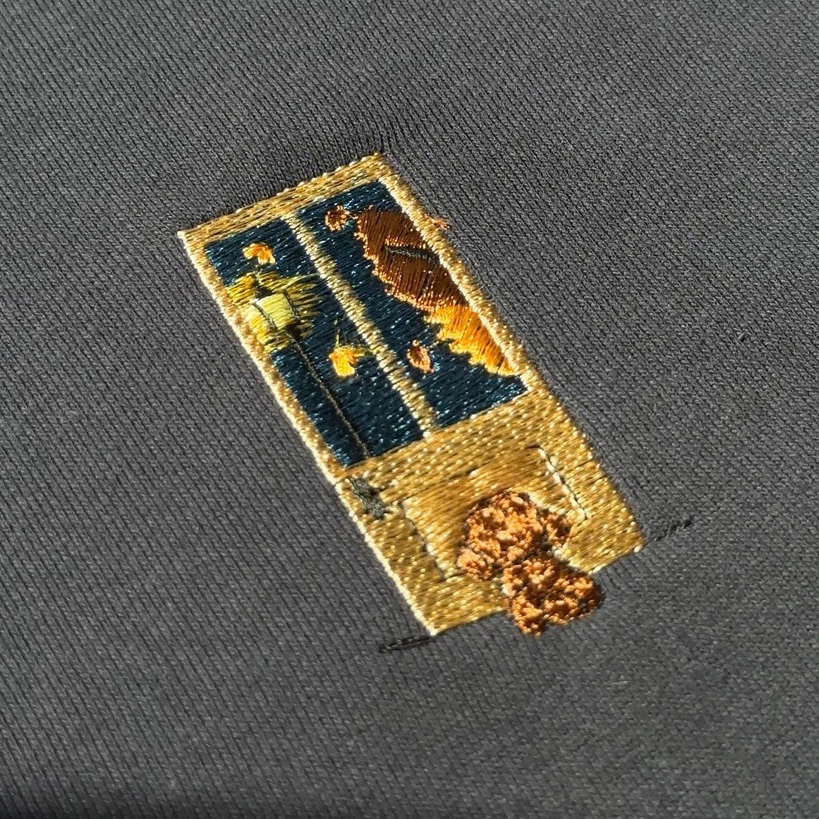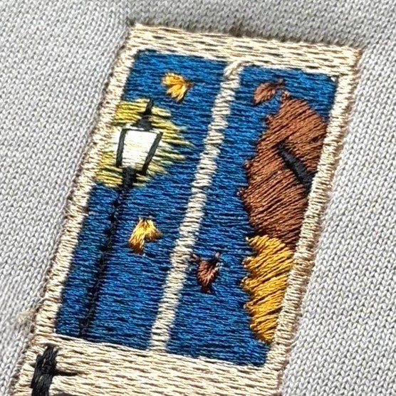 街灯の明かりが夜空にぼんやり滲む様子を、糸で表現しています。