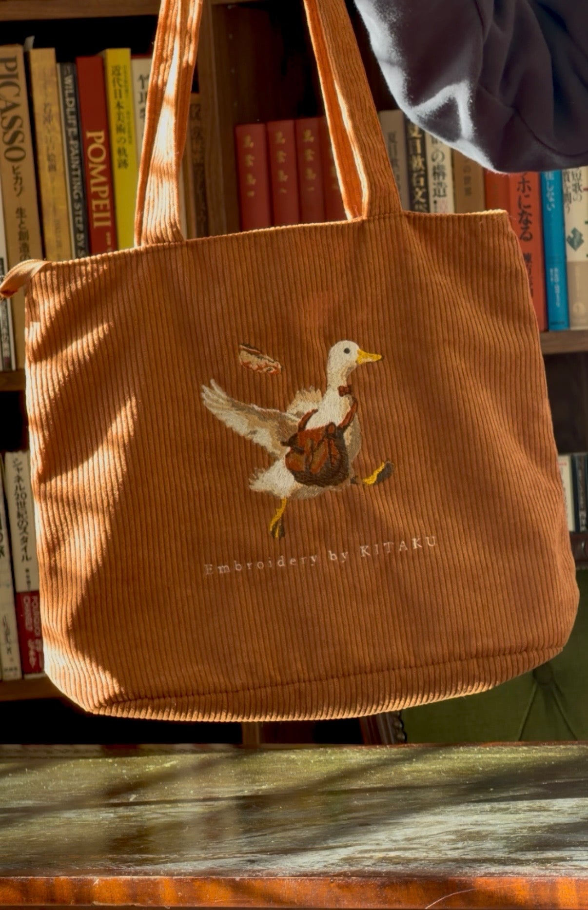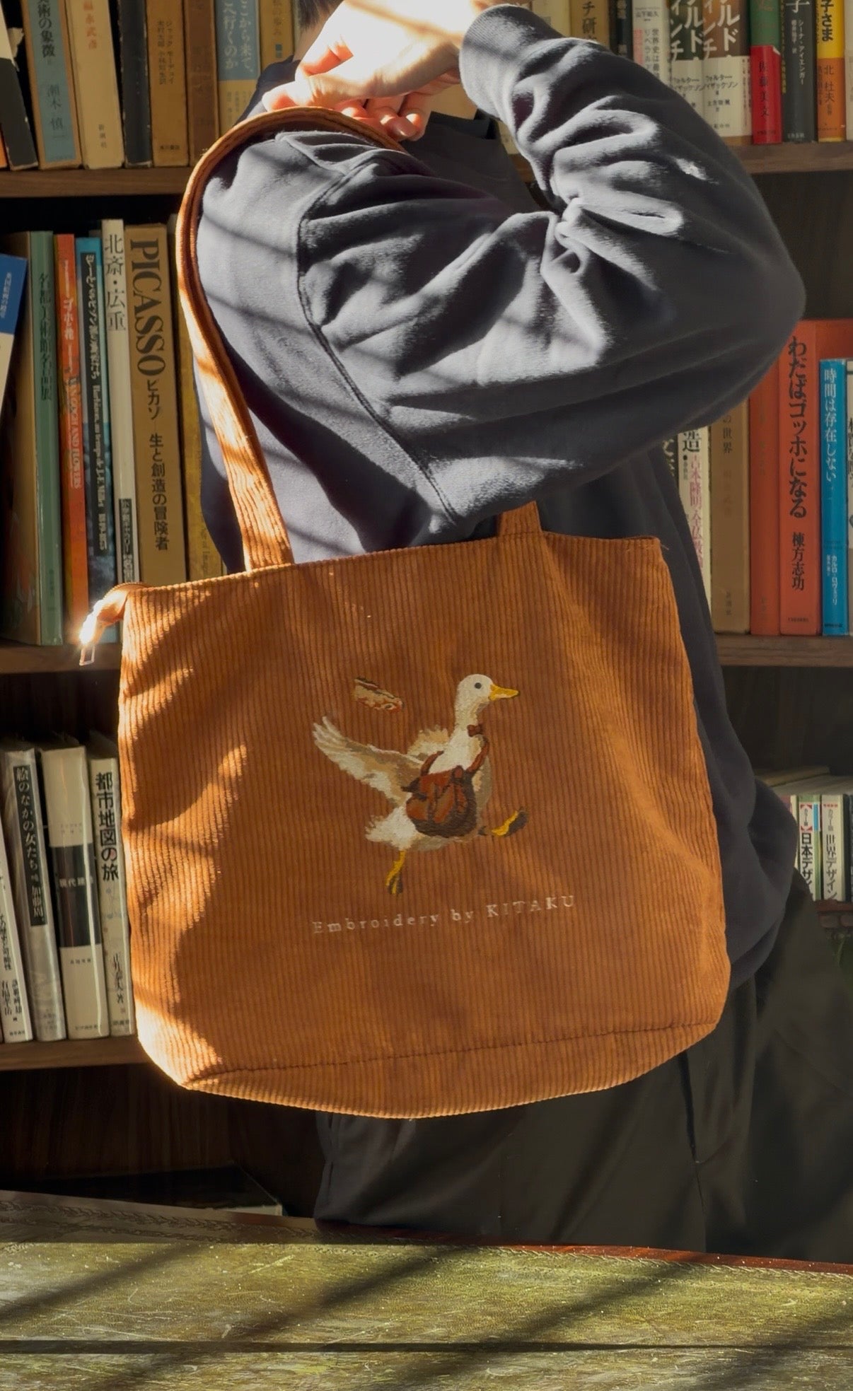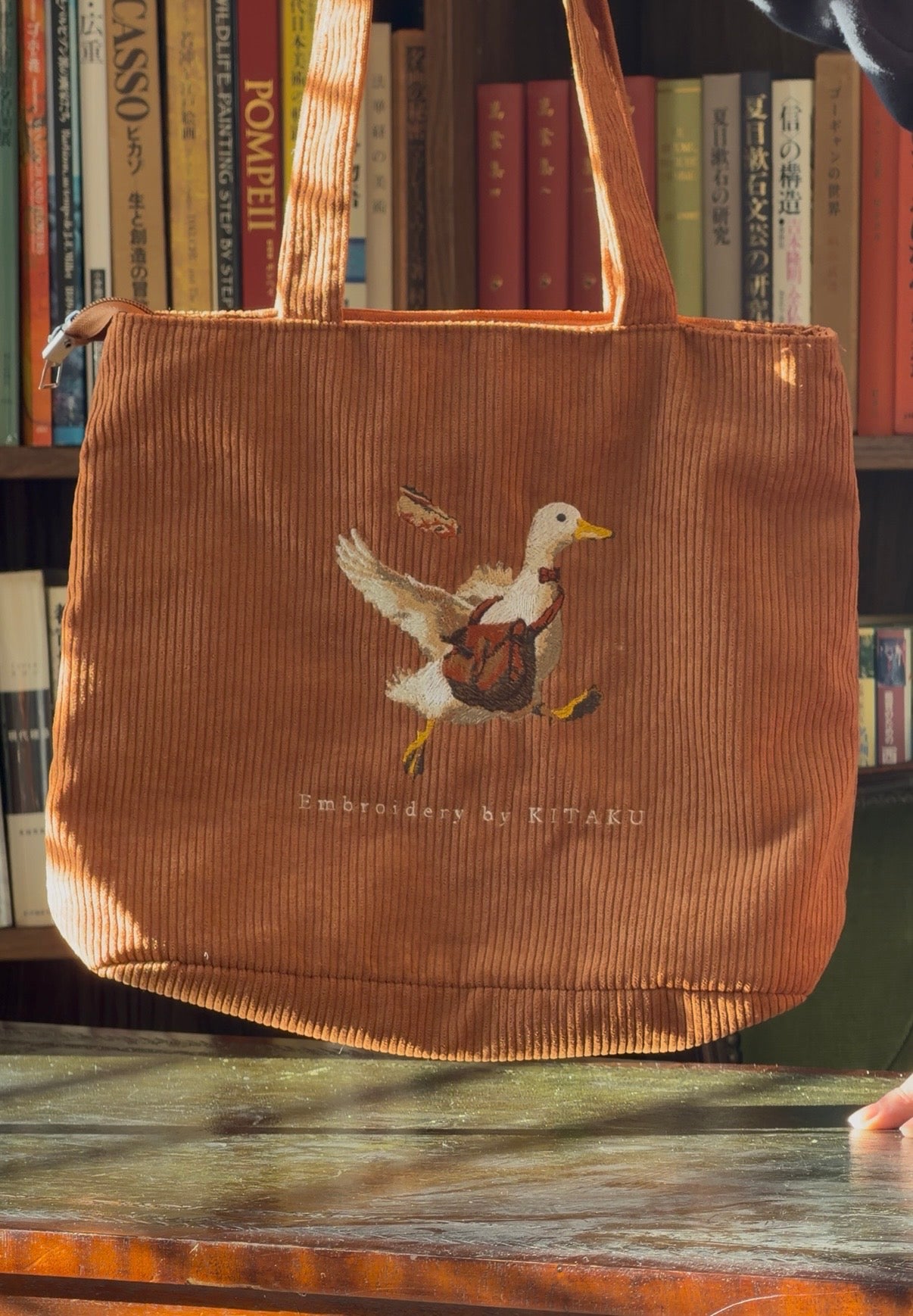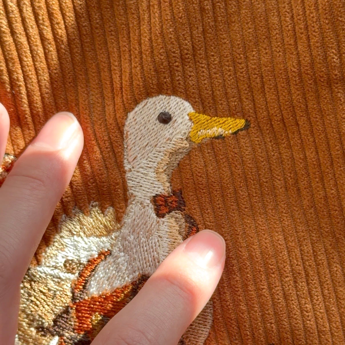 刺繍の温もりと、アヒルのコミカルな動きが絶妙に調和していて、