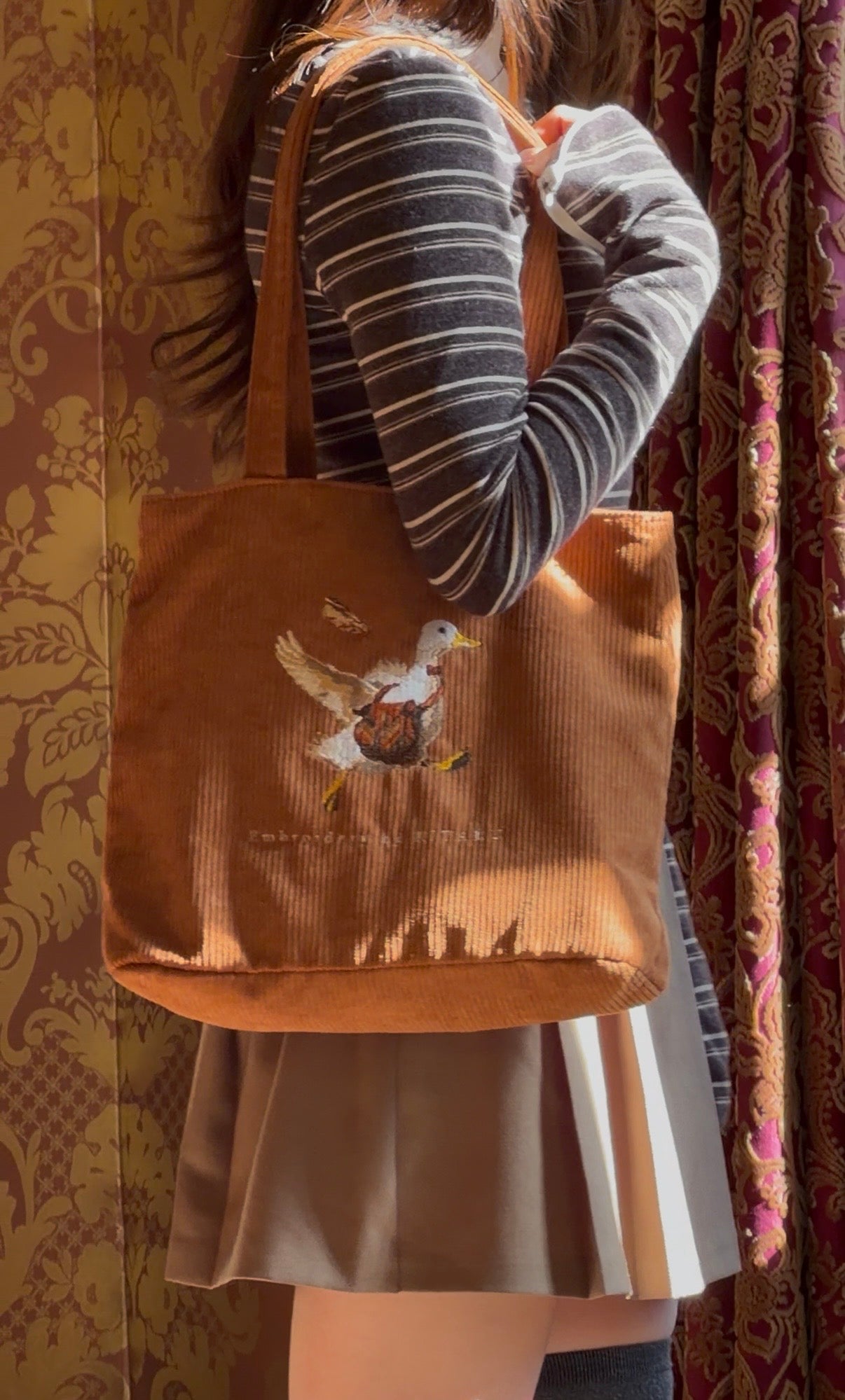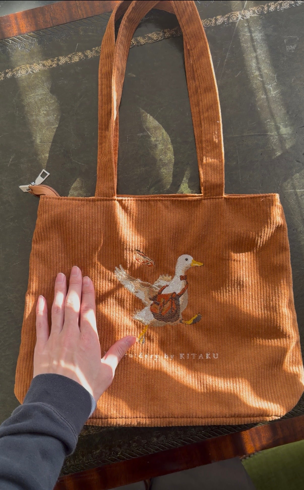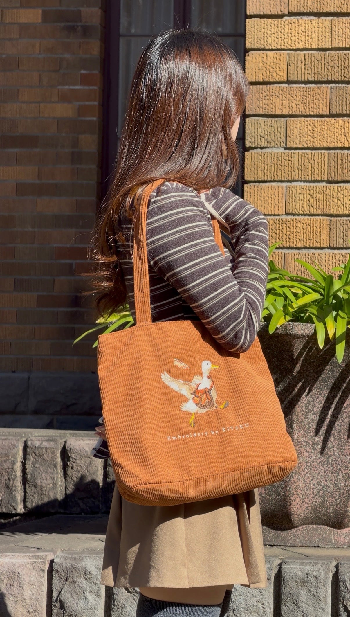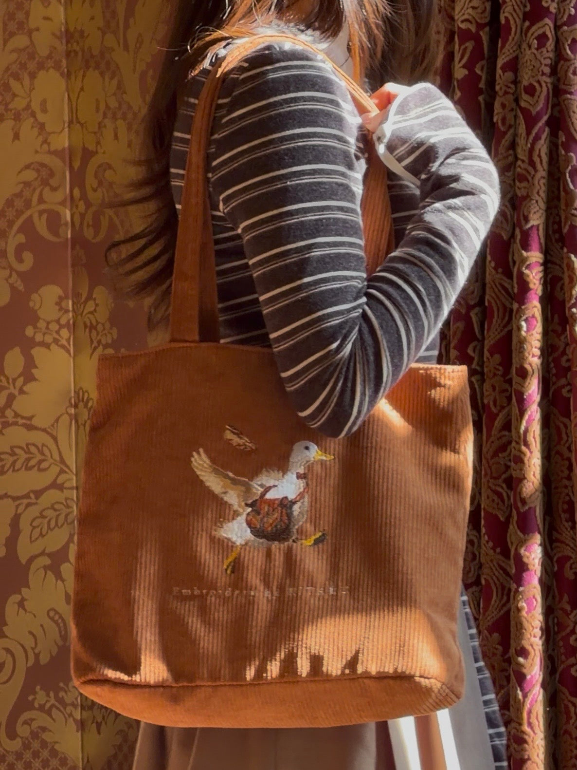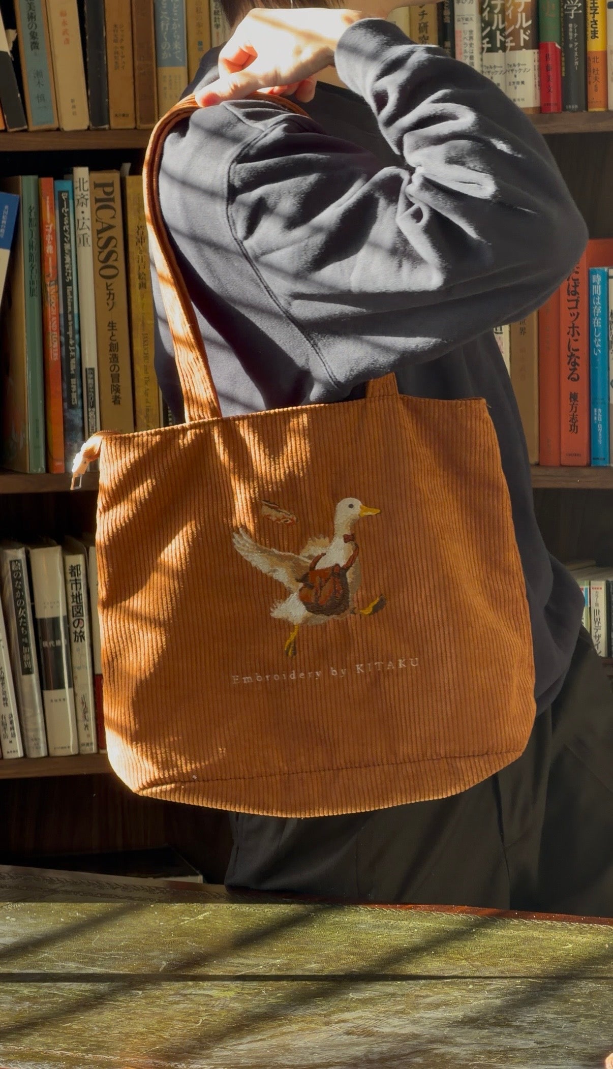 刺繍の温もりと、アヒルのコミカルな動きが絶妙に調和していて、