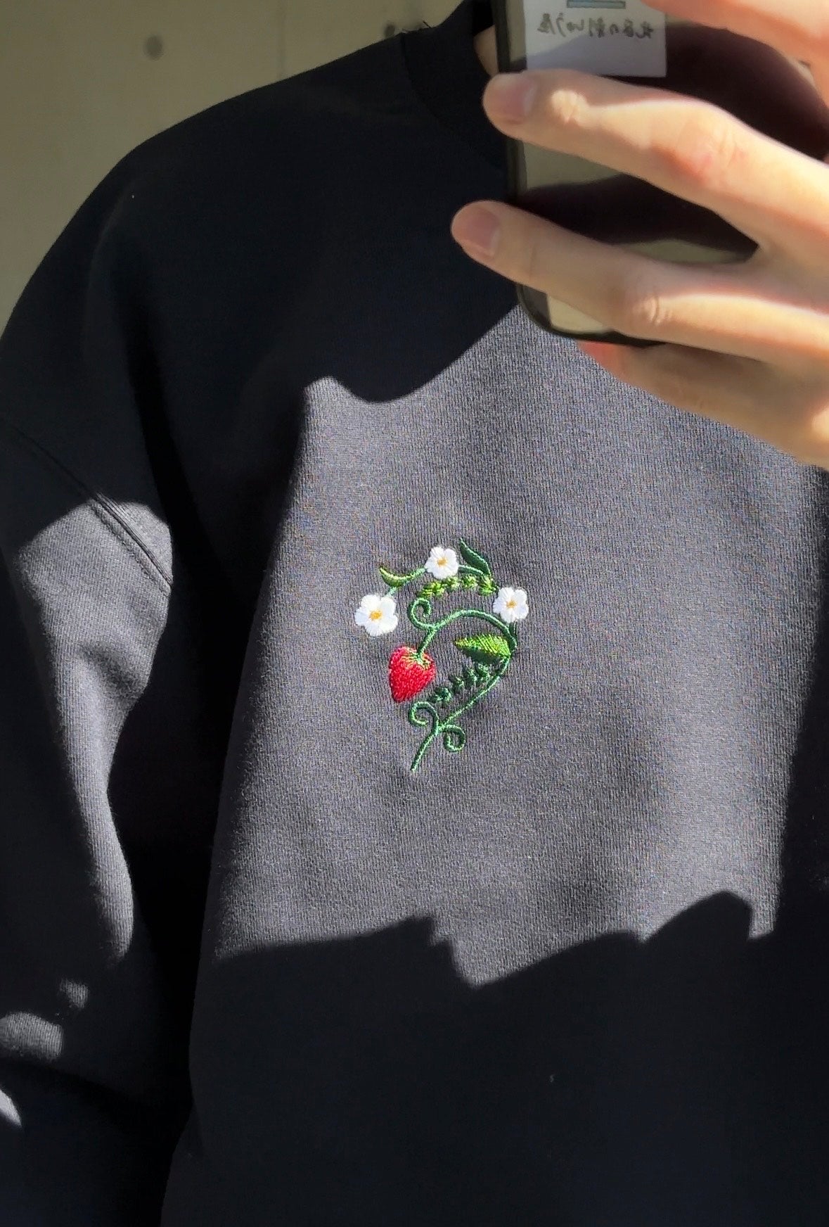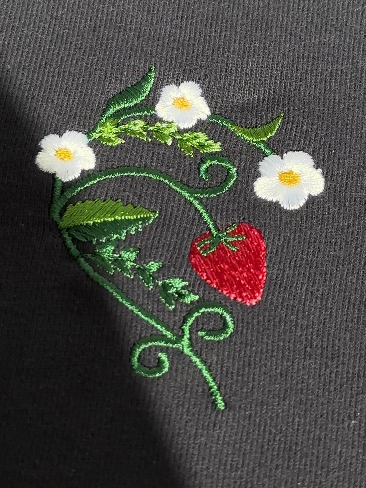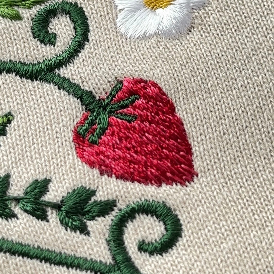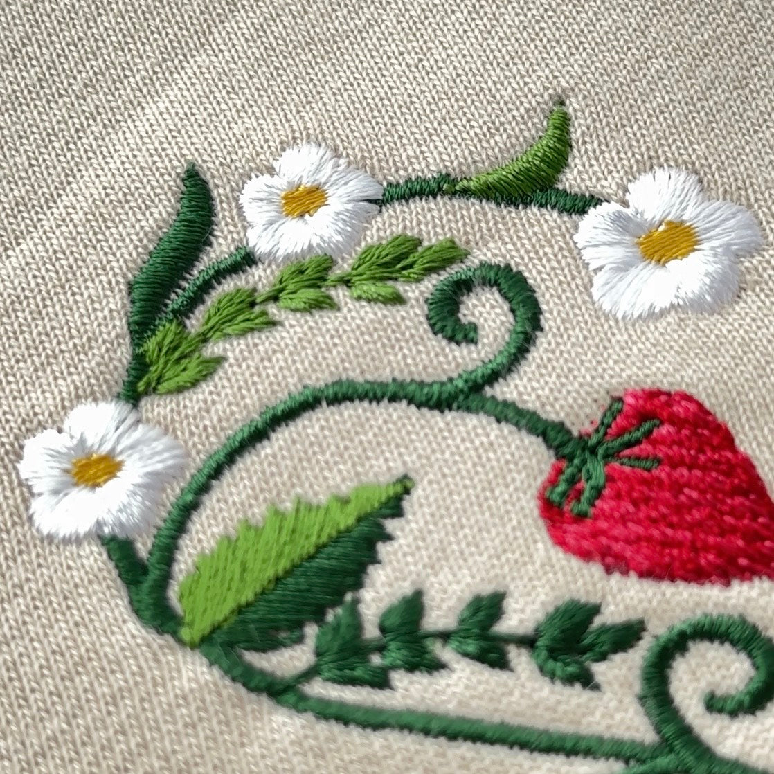 異なる深紅の糸でふっくらとした丸みを表現しています。