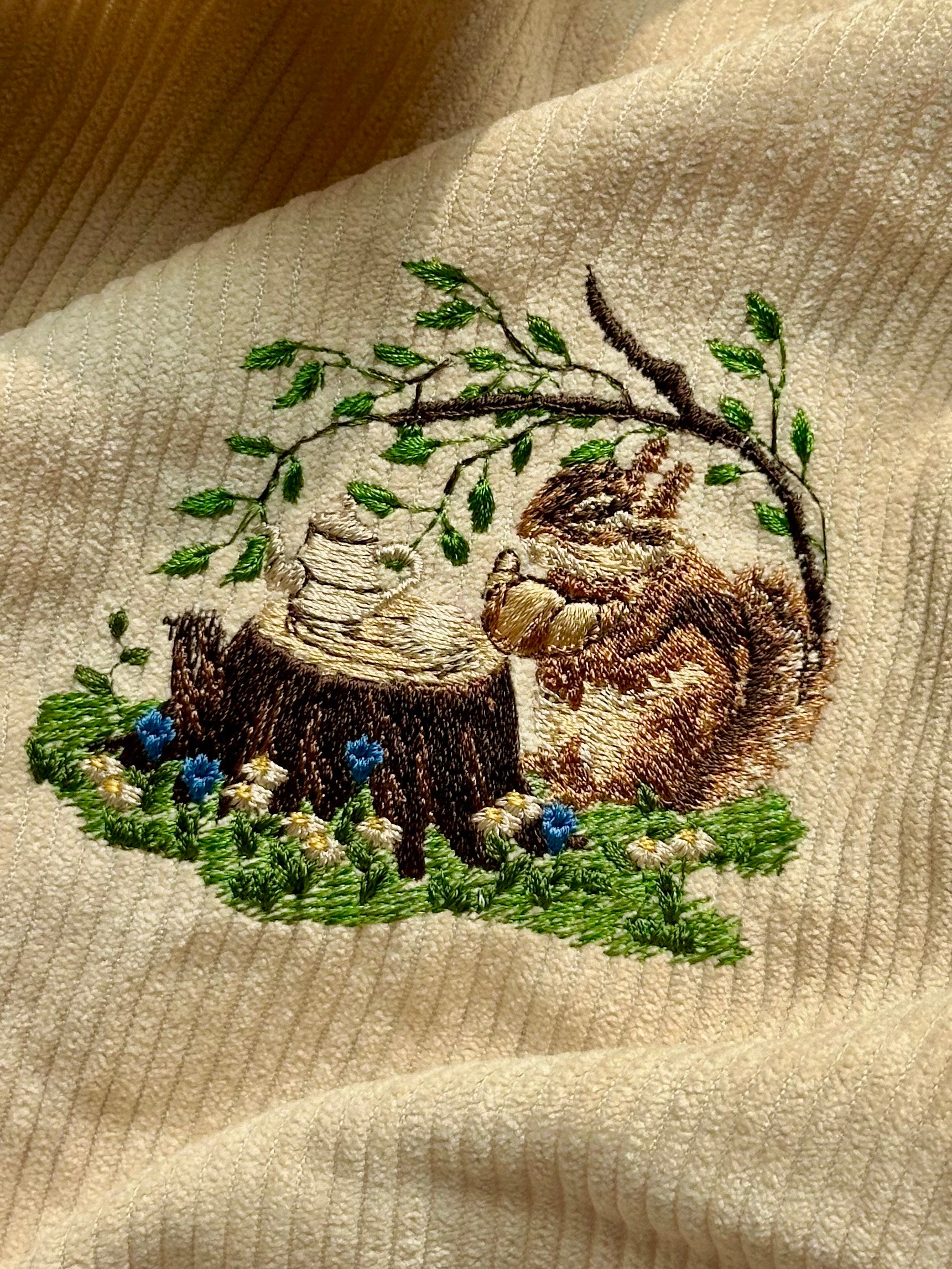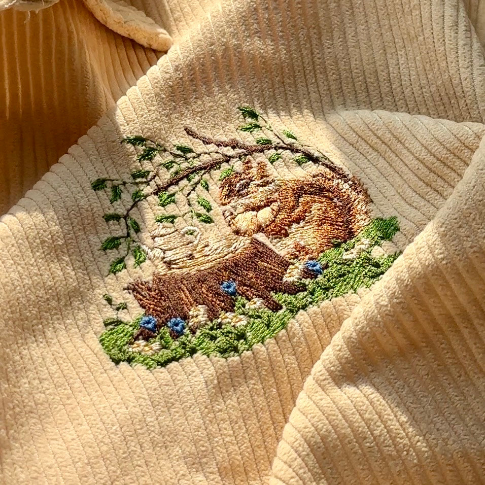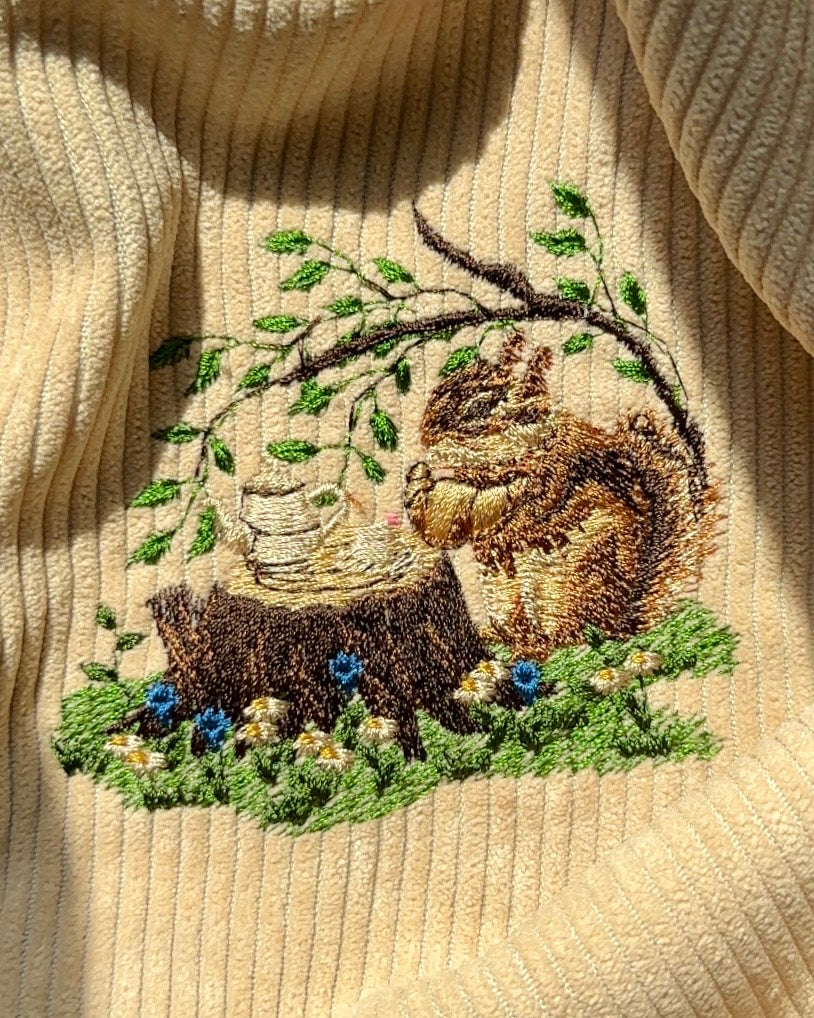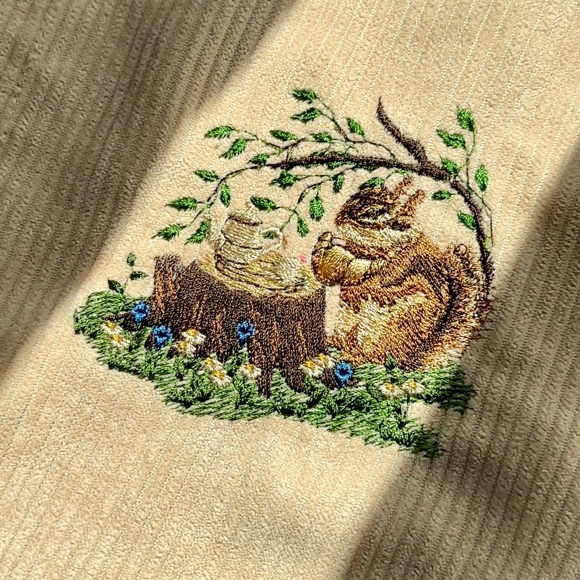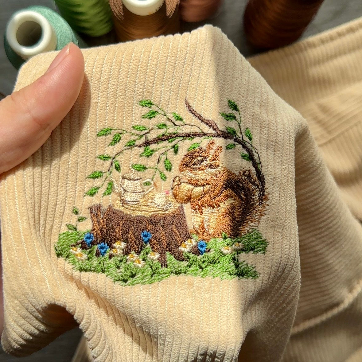 リスはクロワッサンを両手でぎゅっと抱えて、幸せそうにしています。