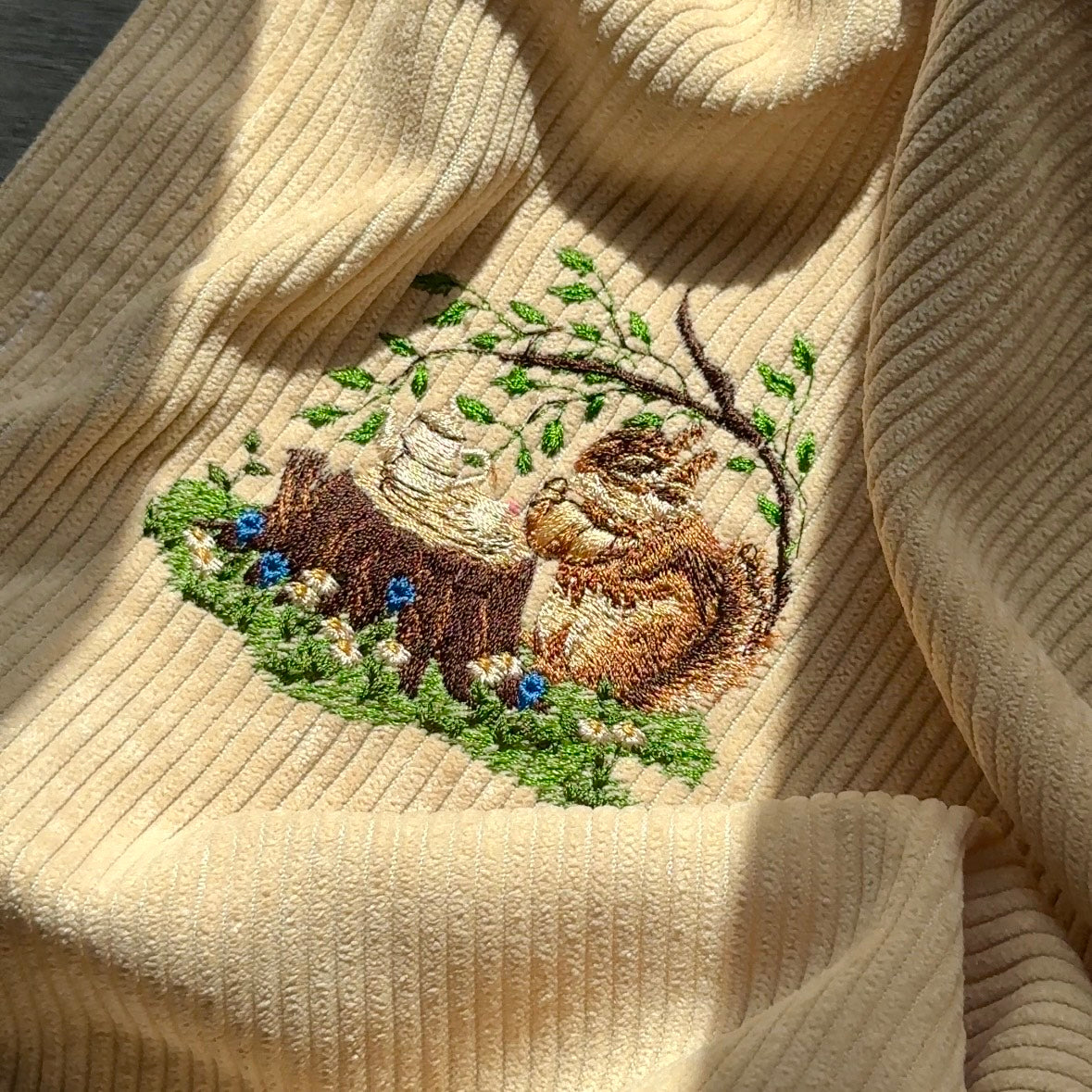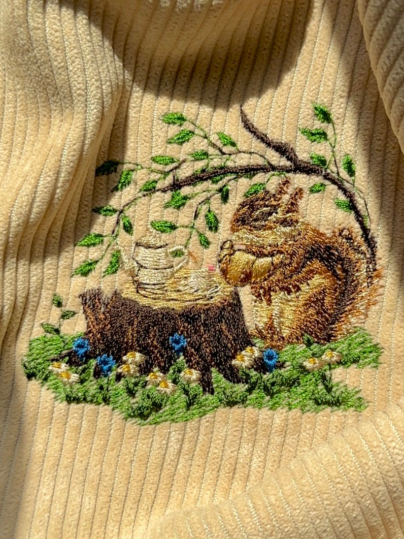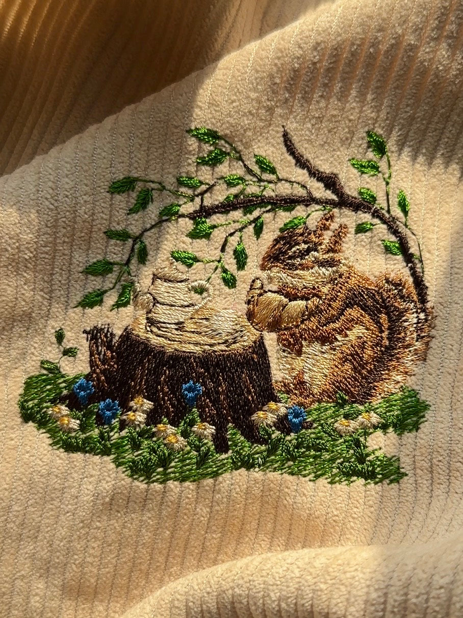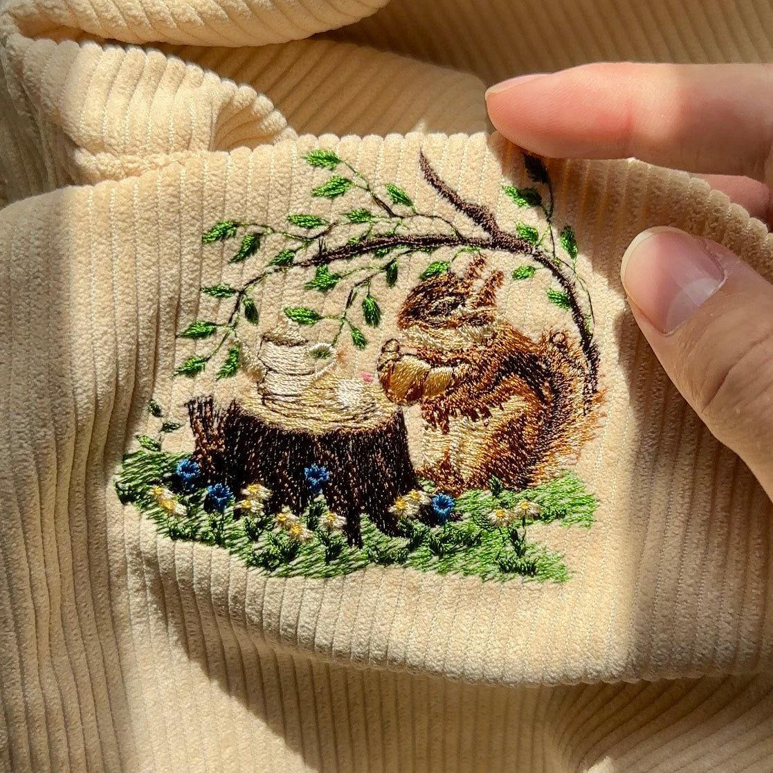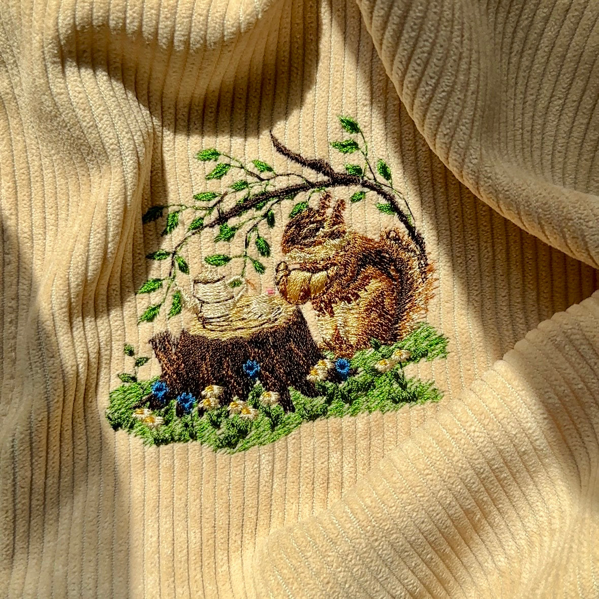 リスはクロワッサンを両手でぎゅっと抱えて、幸せそうにしています。