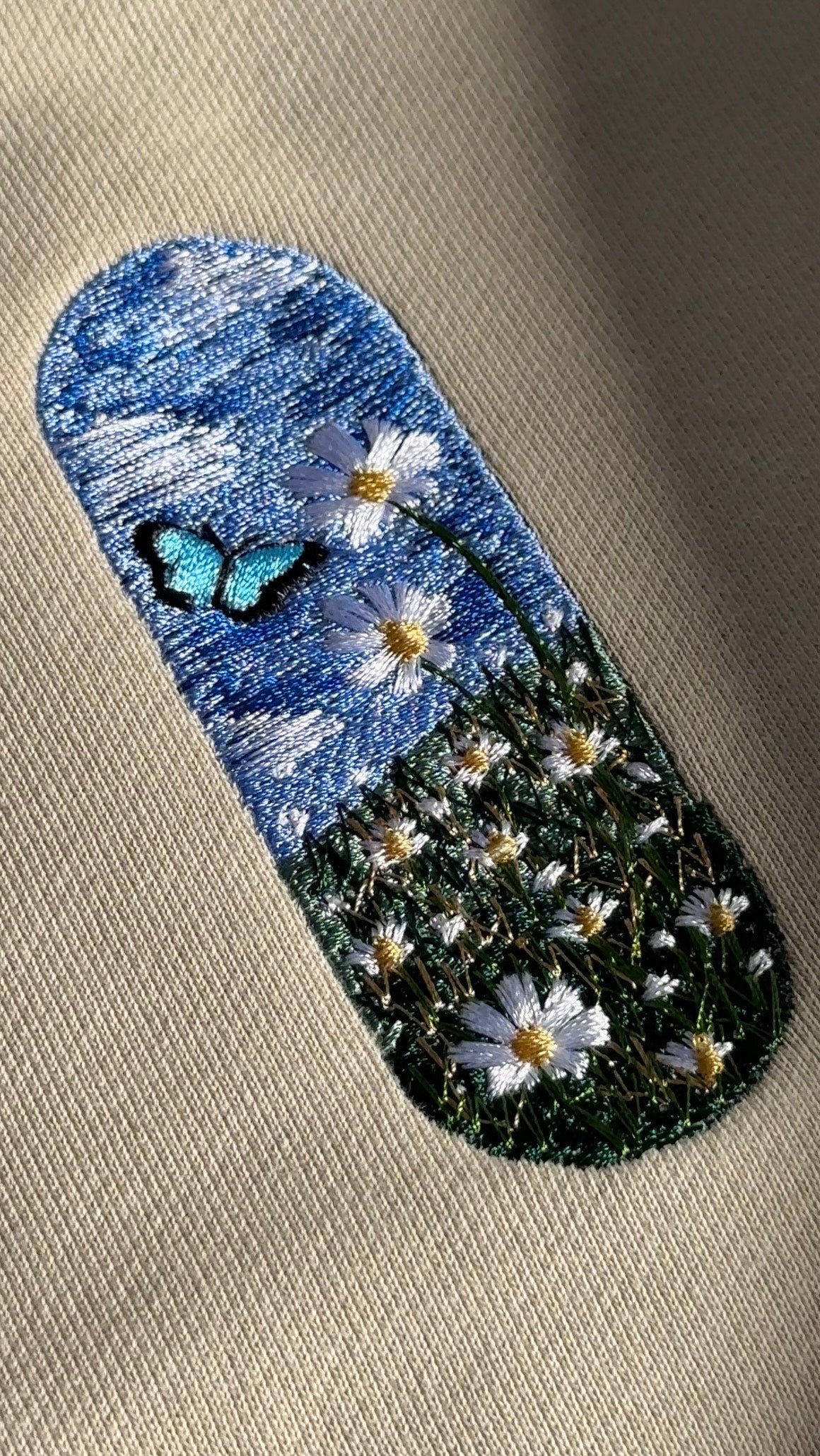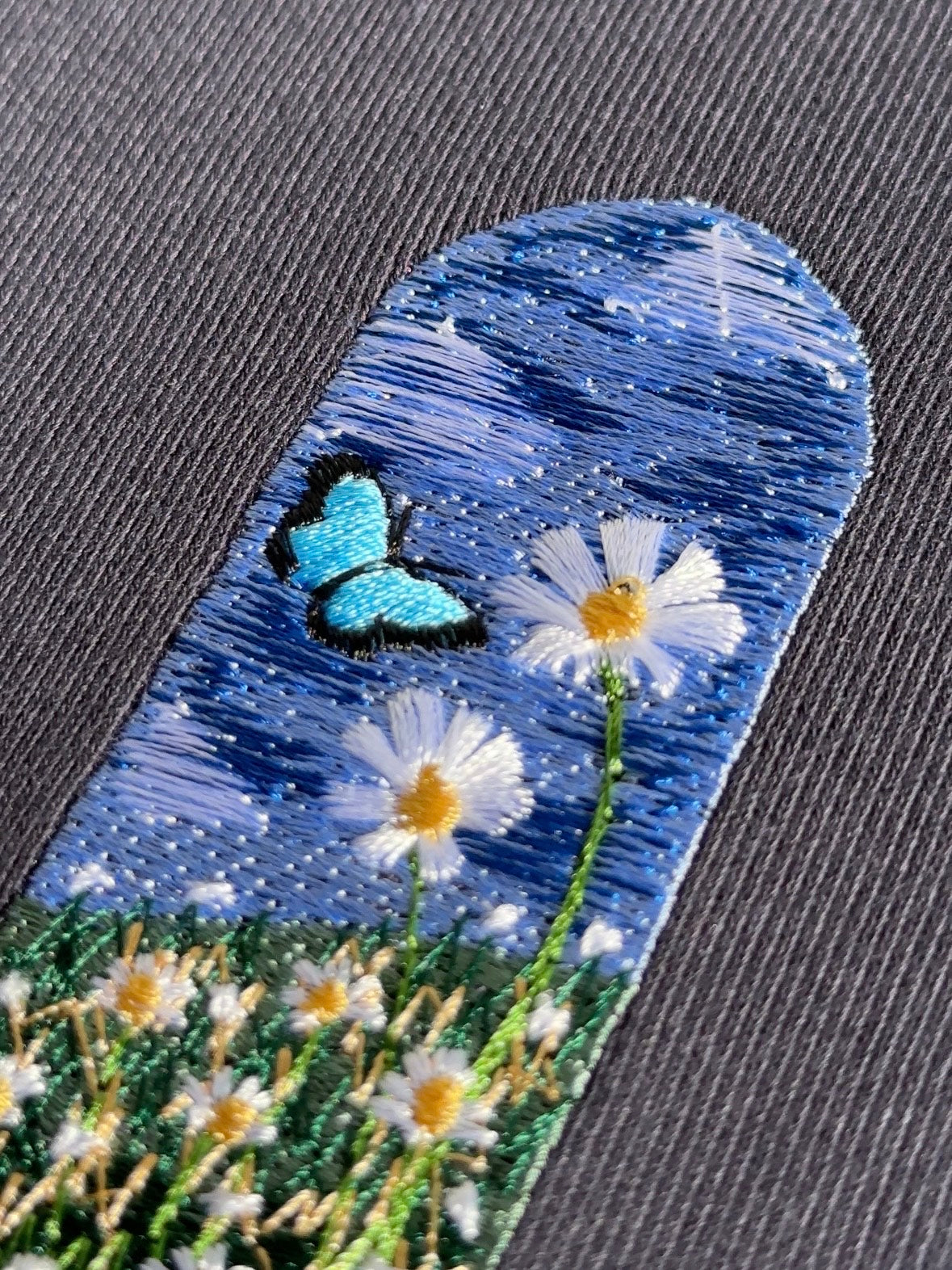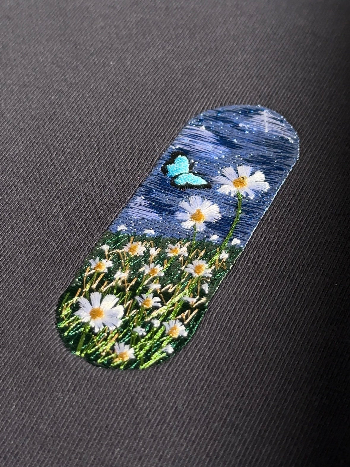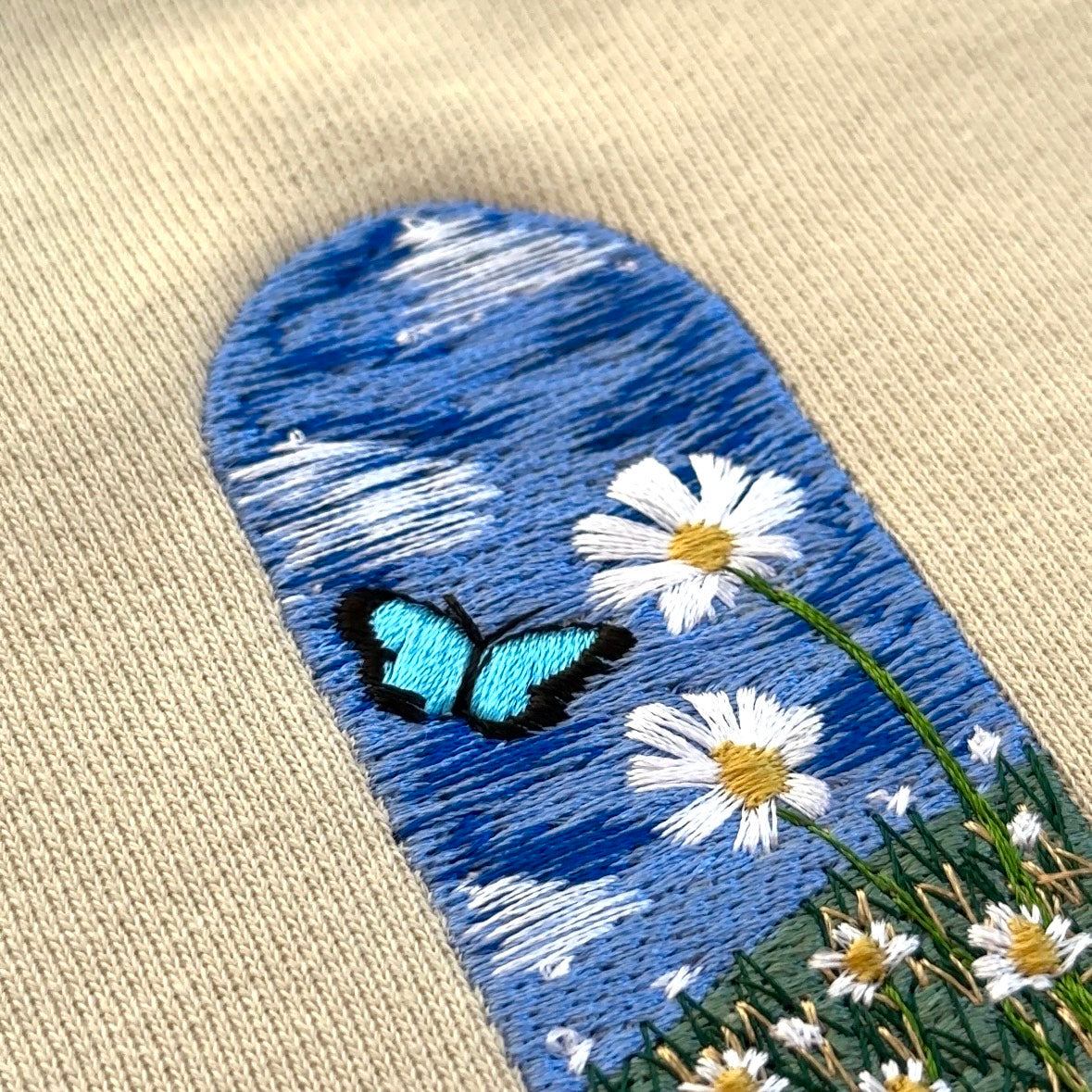 ひとひらの蝶は刺繍でぷっくり、立体的にしています。