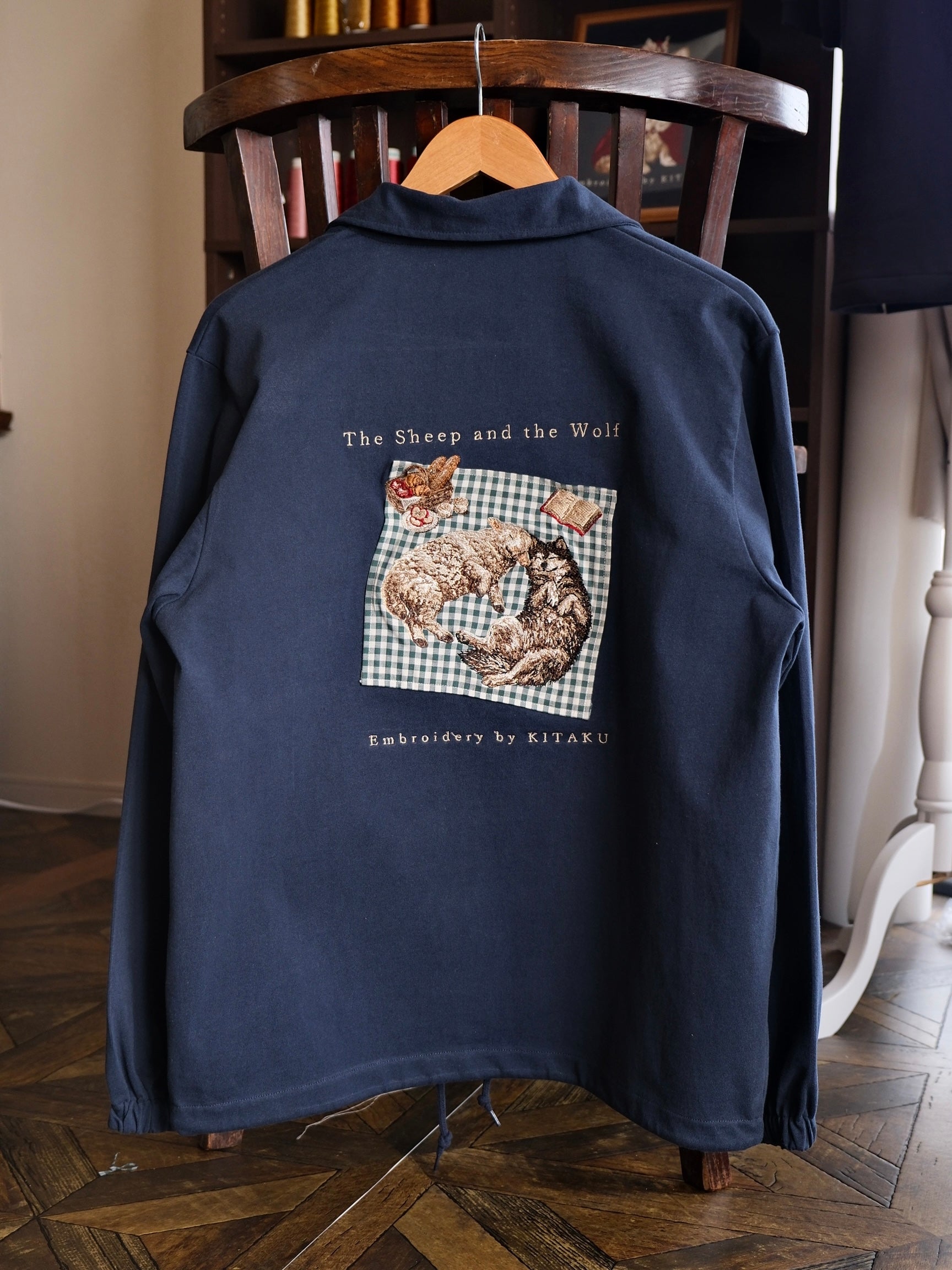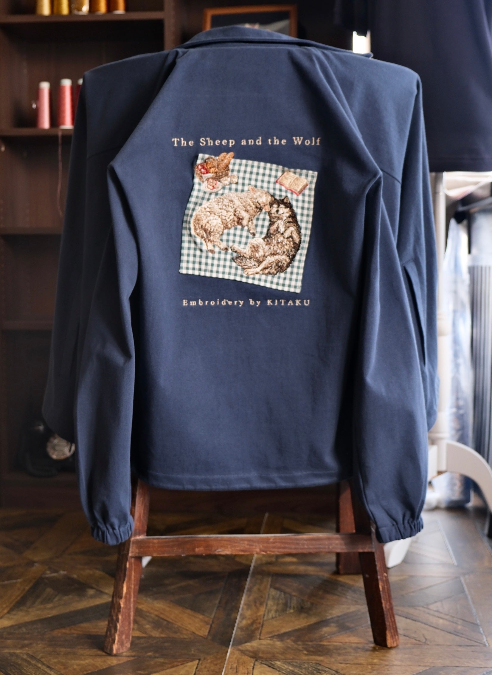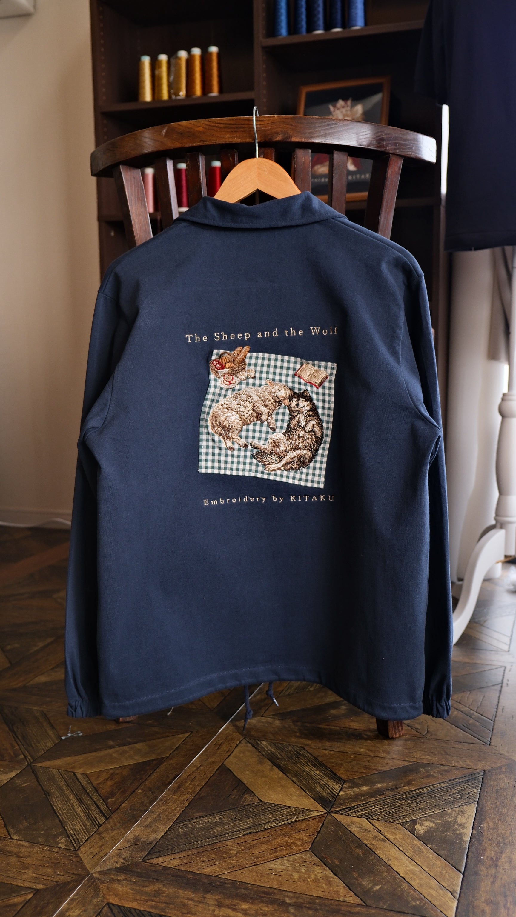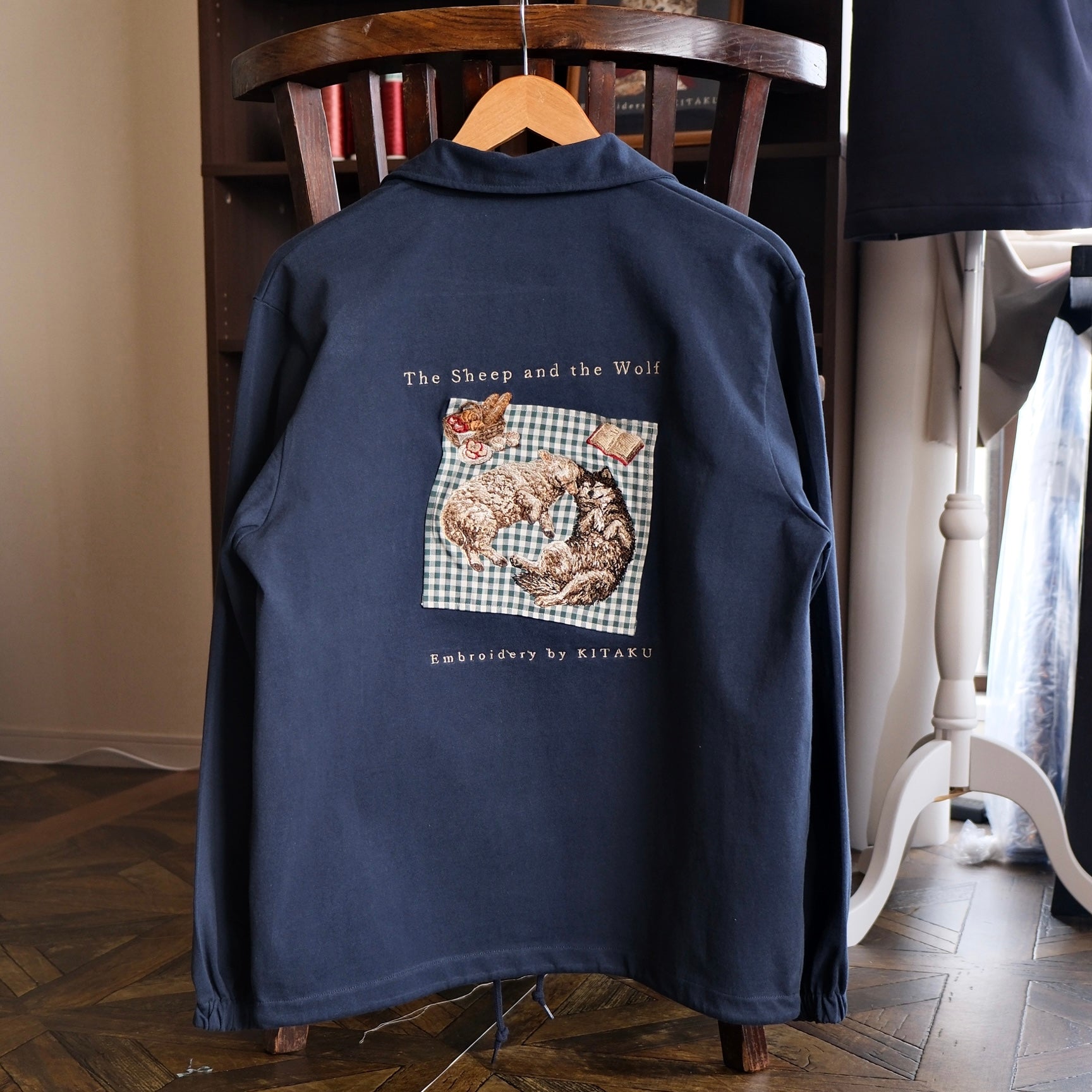 今回のジャケットは、椅子に掛けるだけで眺められる、芸術になりました。
