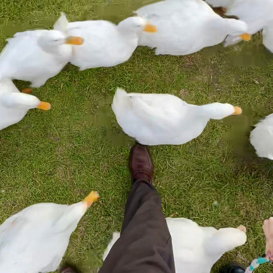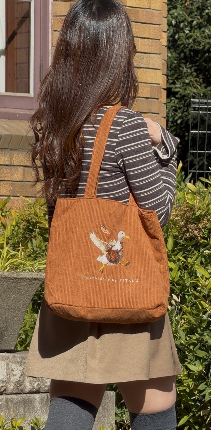 刺繍の温もりと、アヒルのコミカルな動きが絶妙に調和していて、
