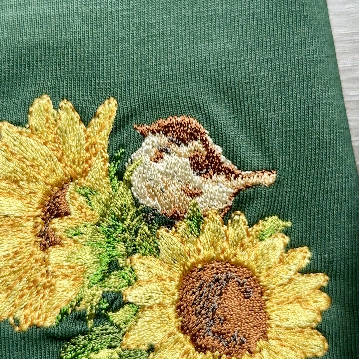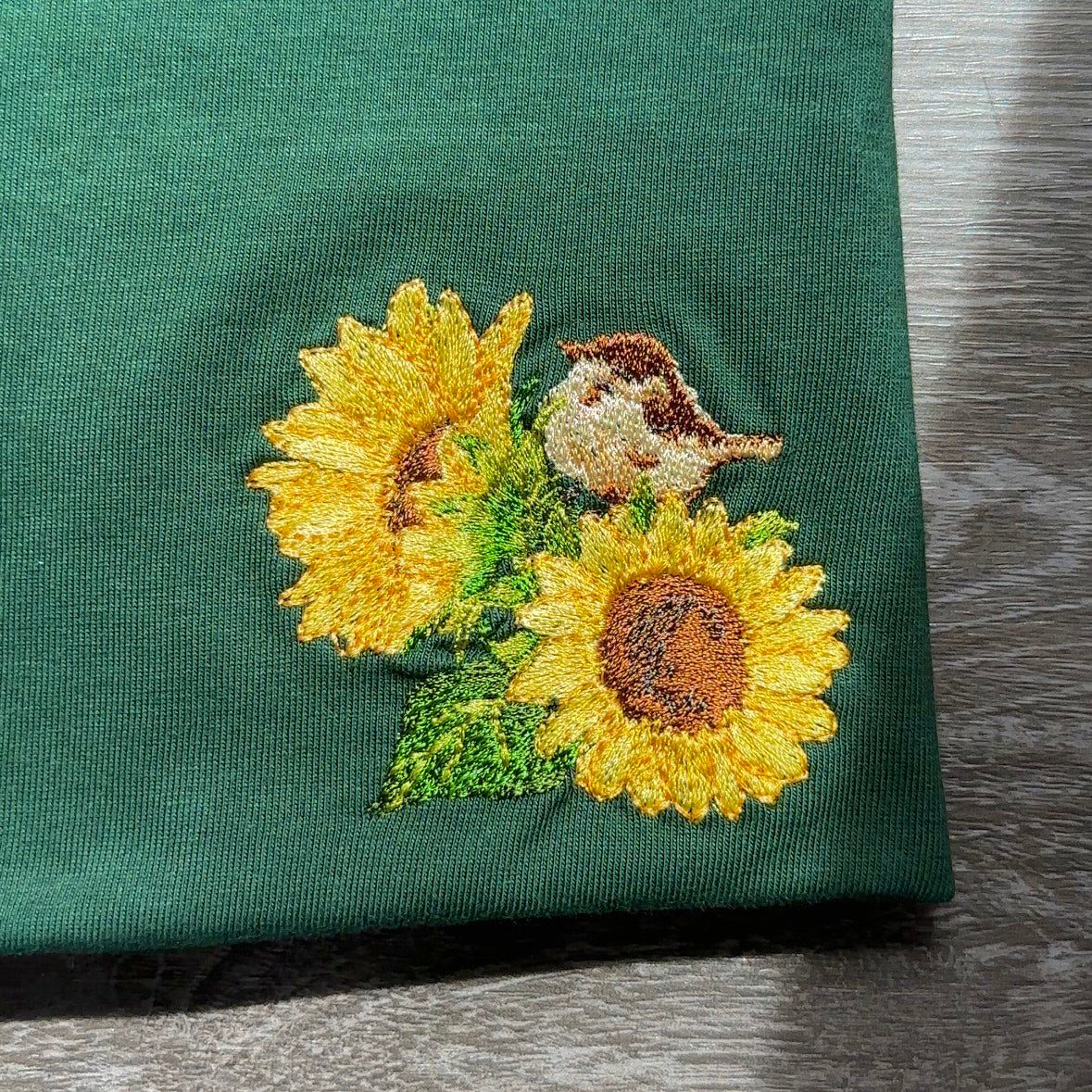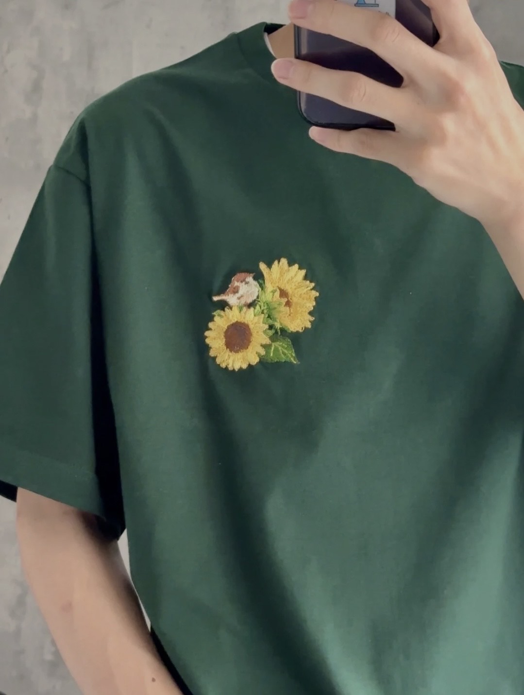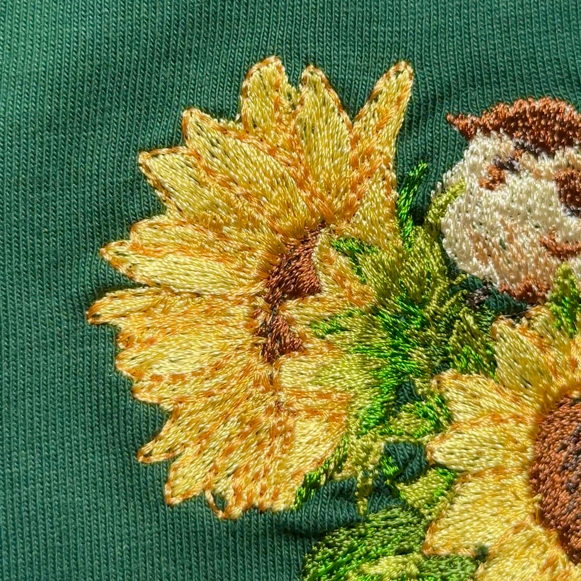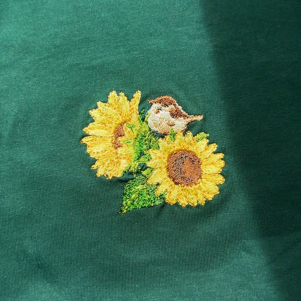 だからこそこの刺繍では、ひまわりを立体的に、まるで本当に太陽の方を向いて咲いているように表現することにこだわりました🌻😊
