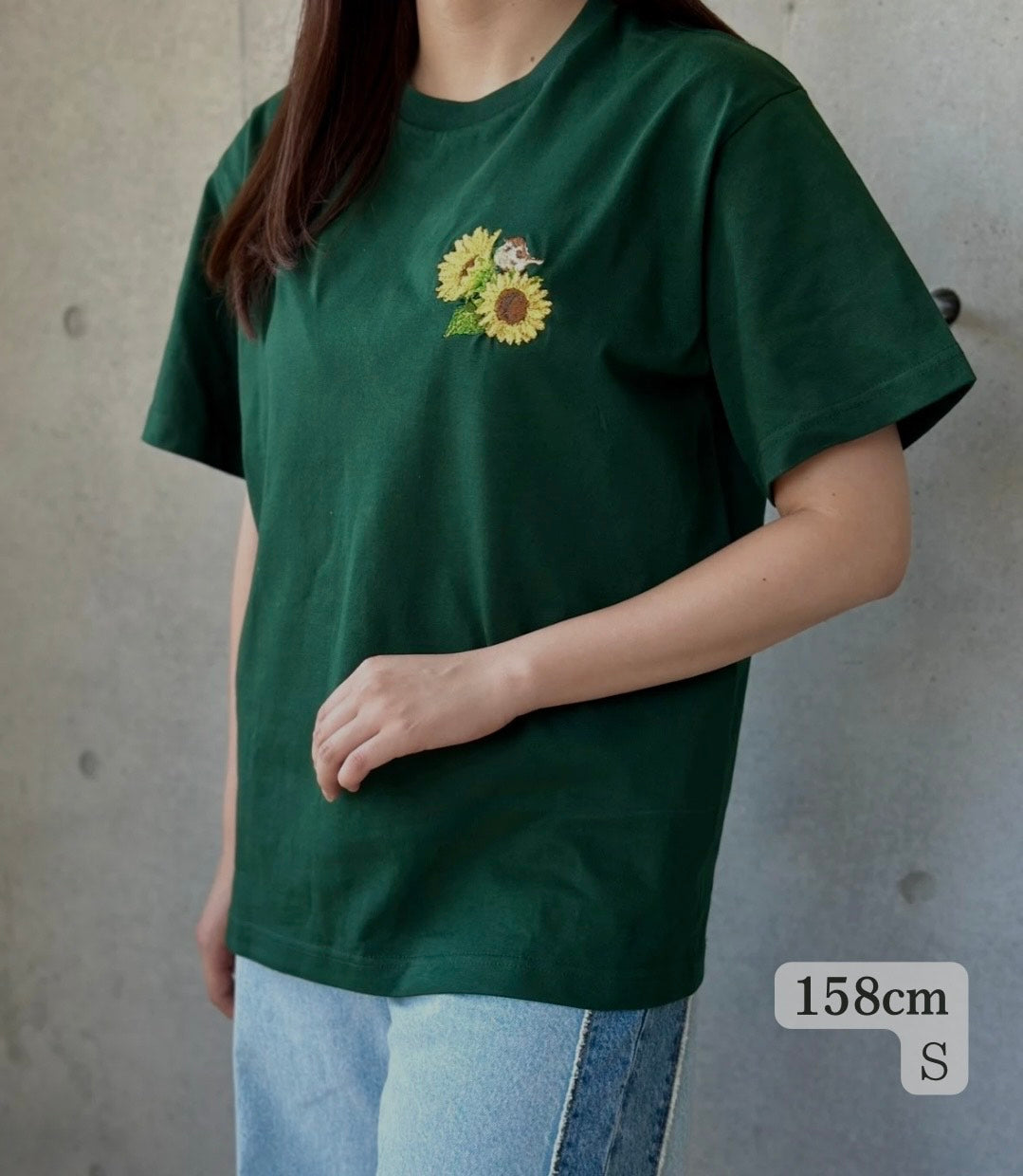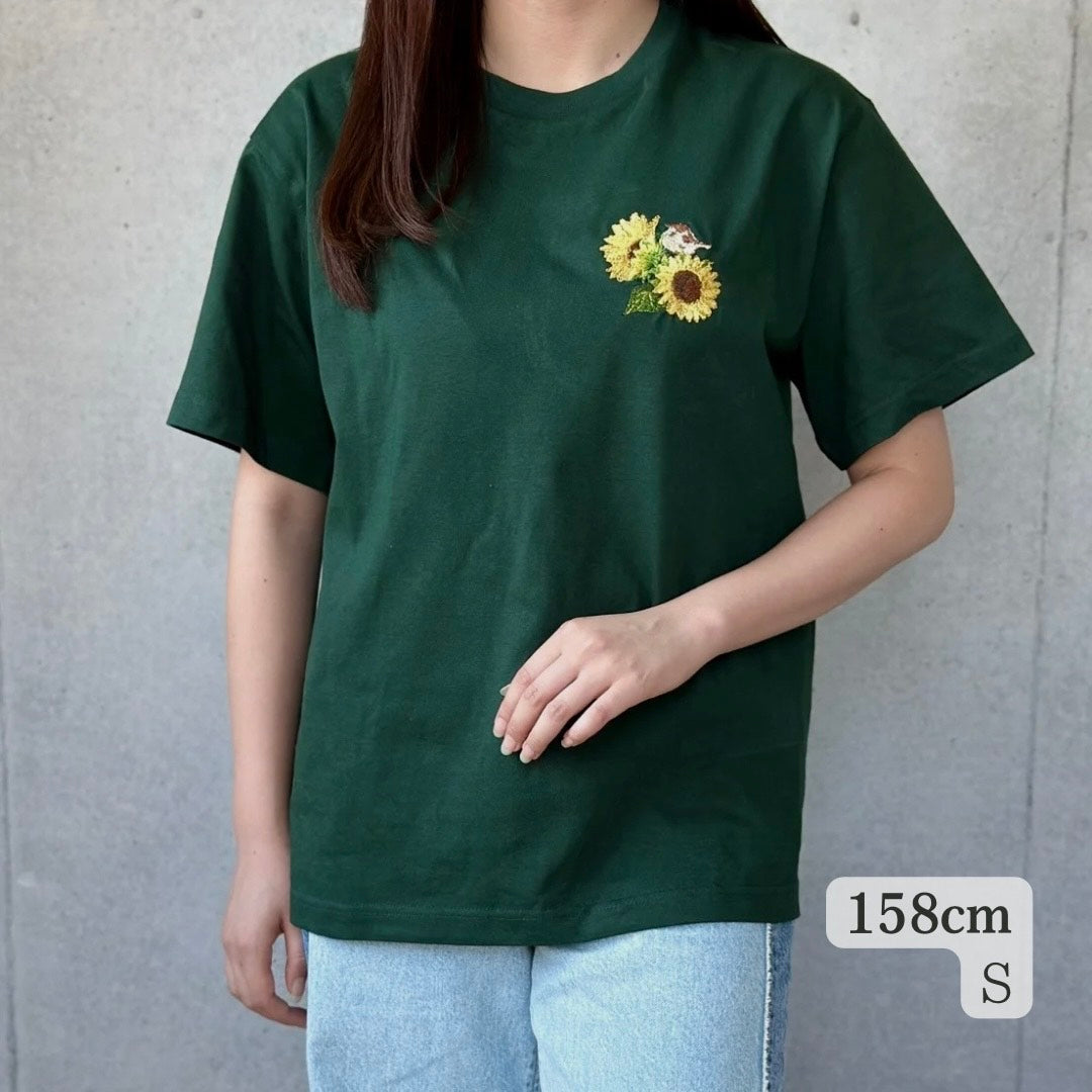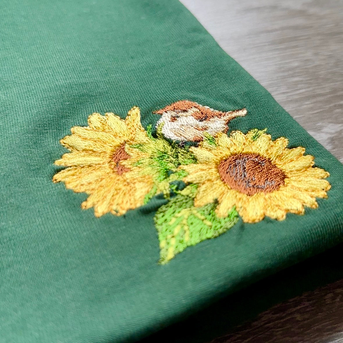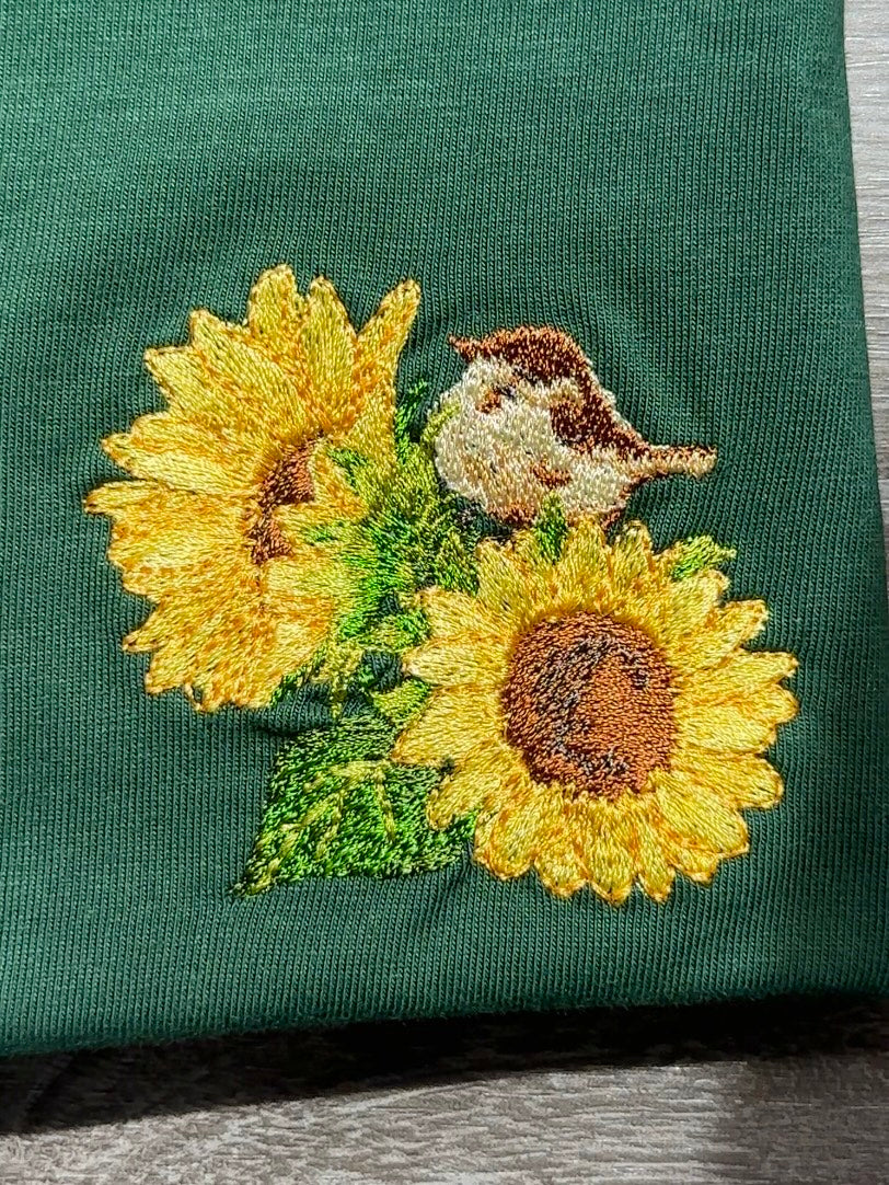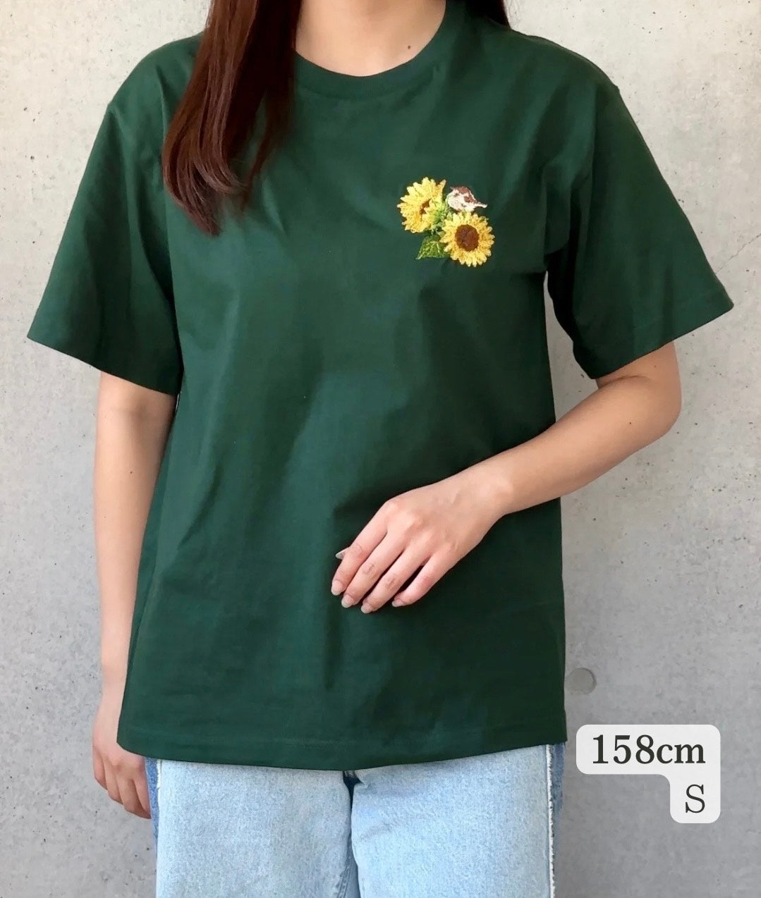だからこそこの刺繍では、ひまわりを立体的に、まるで本当に太陽の方を向いて咲いているように表現することにこだわりました🌻😊