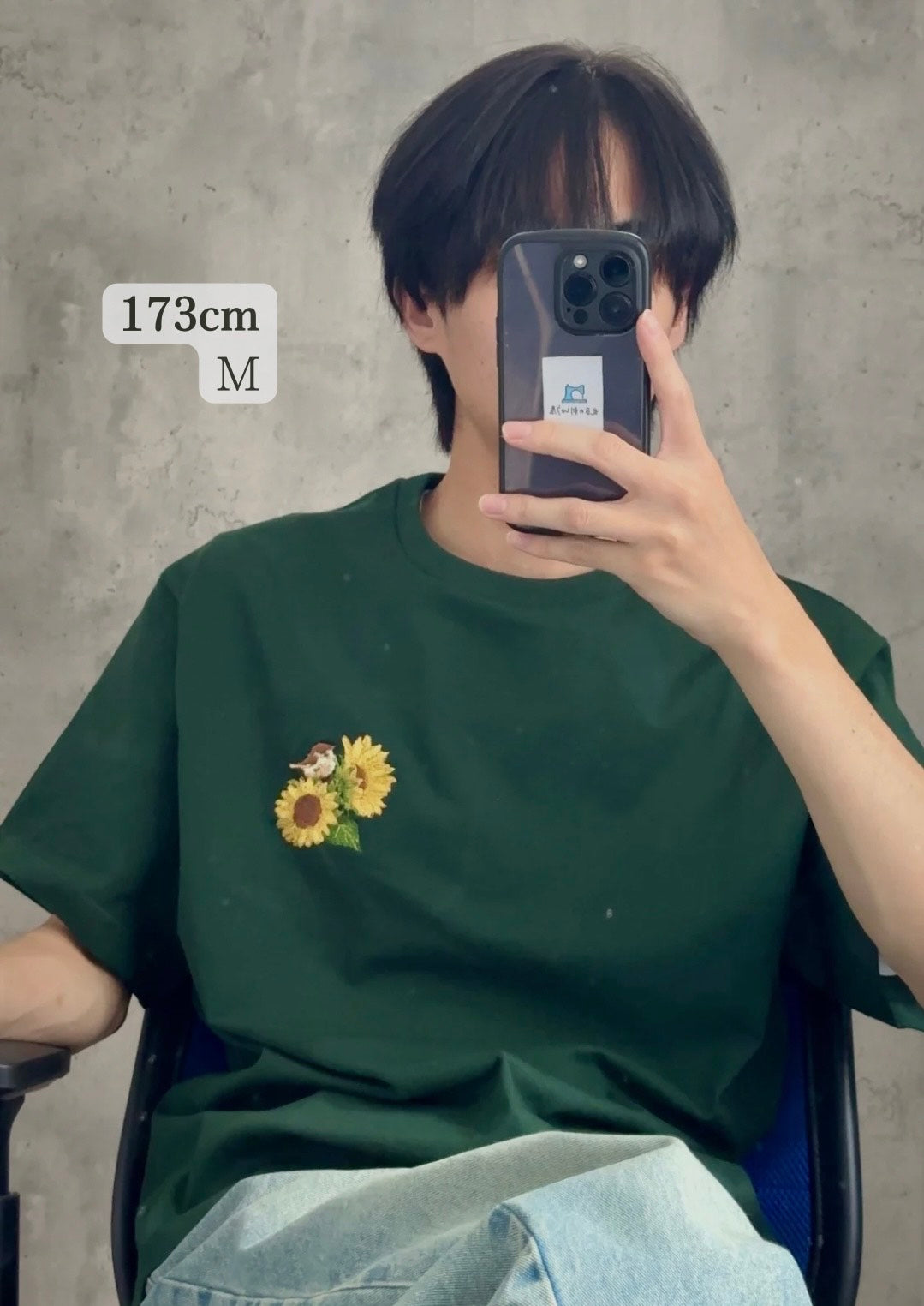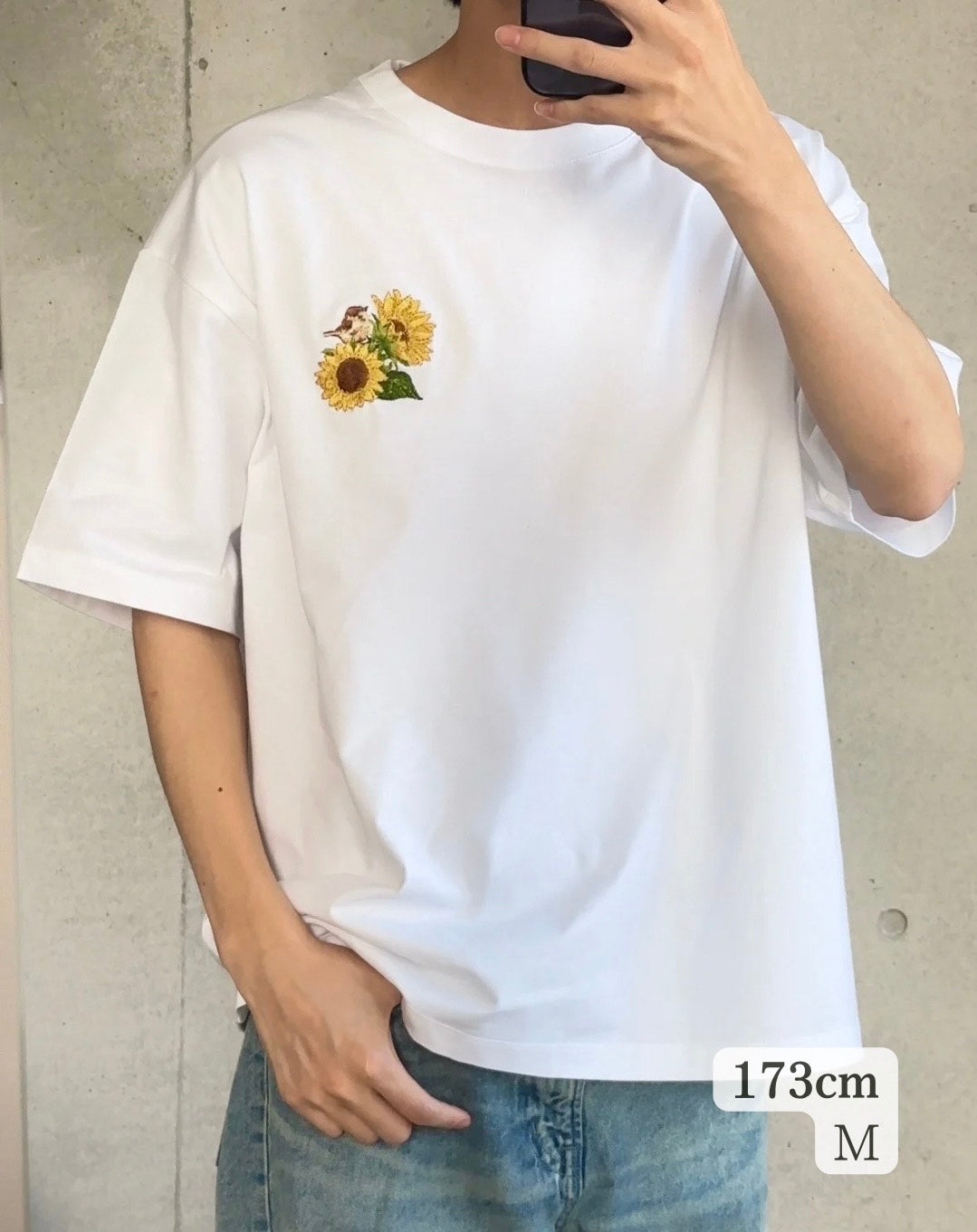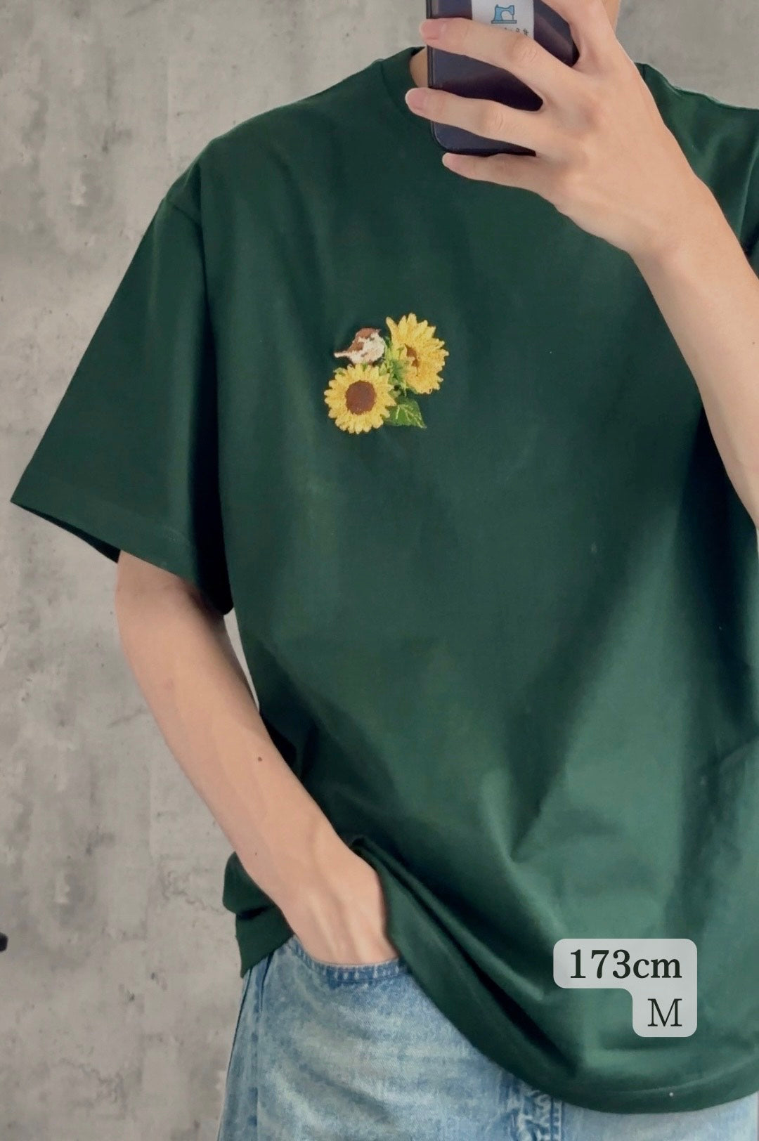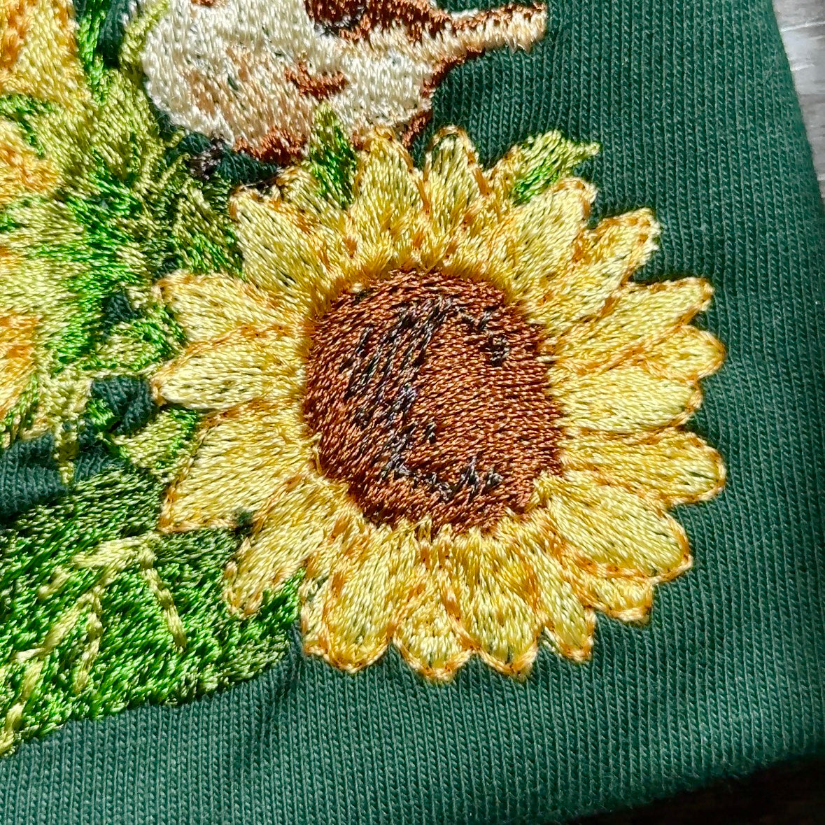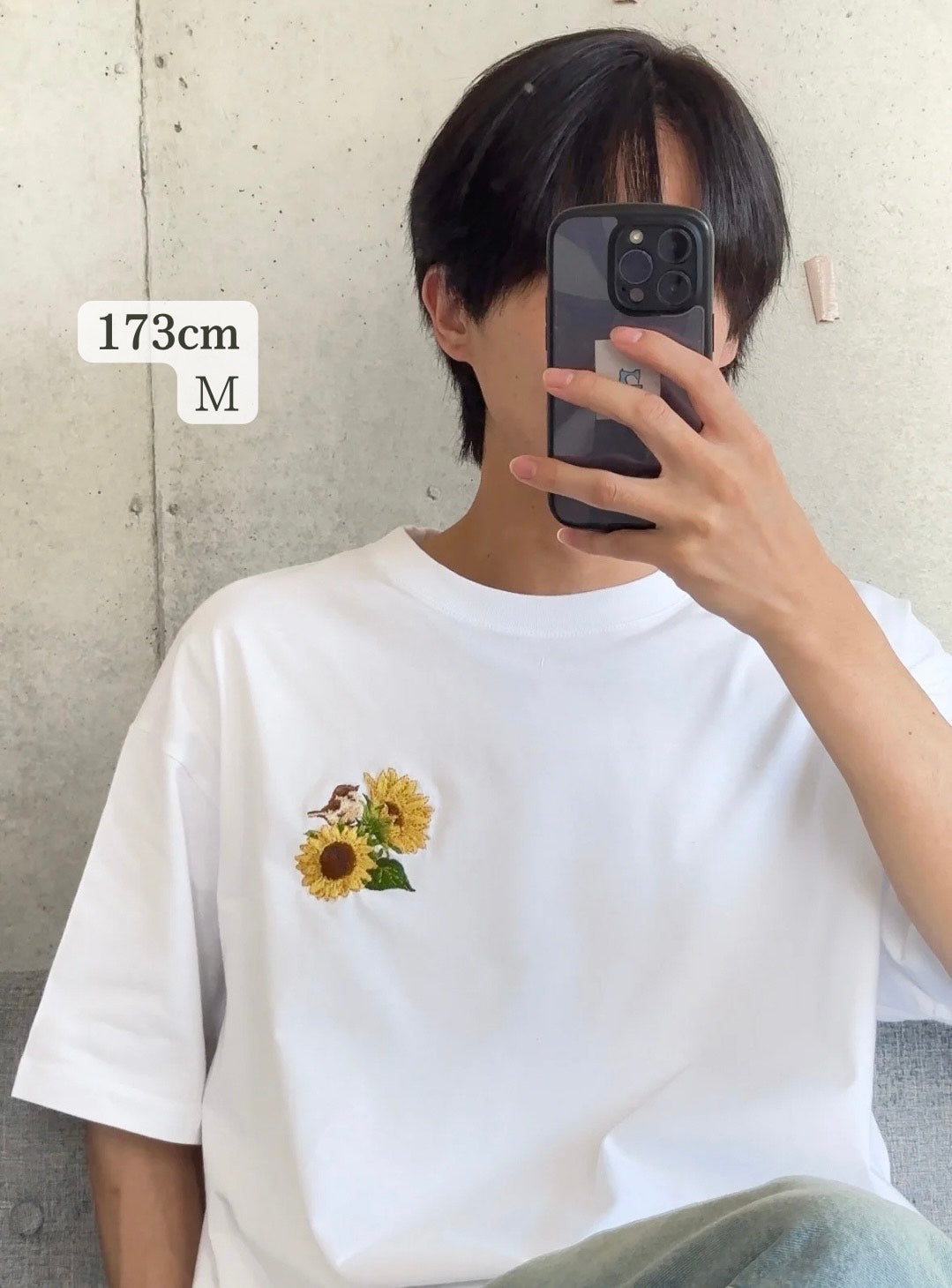 だからこそこの刺繍では、ひまわりを立体的に、まるで本当に太陽の方を向いて咲いているように表現することにこだわりました🌻😊